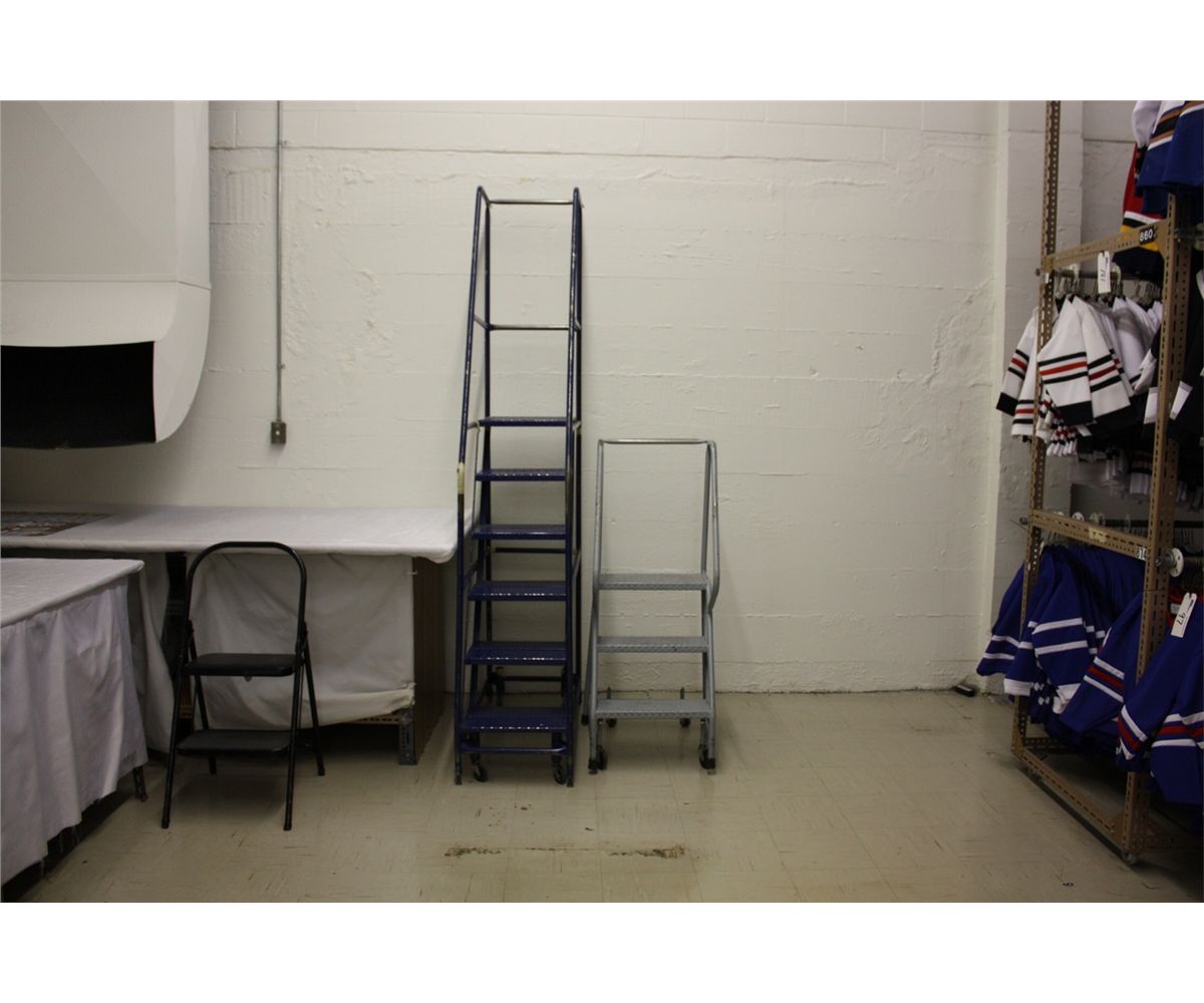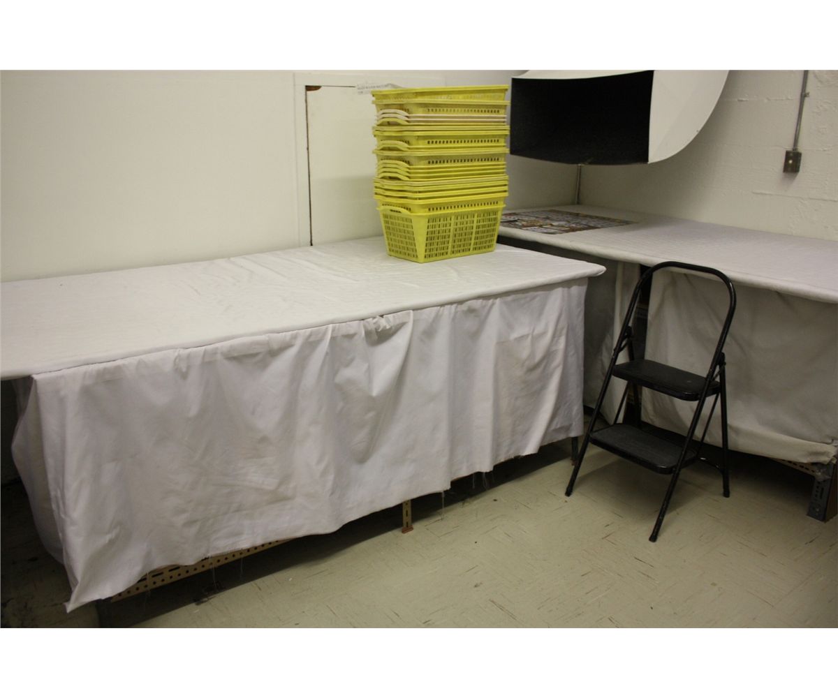 LOT OF ASSORTED WAREHOUSE ITEMS INC: 2 LAYOUT TABLES, TALL STEPS, SHORT STEPS AND BASKETS
