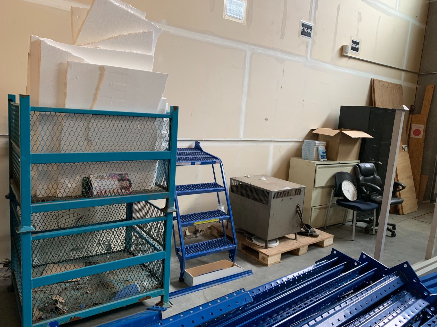 LOT OF ASSORTED WAREHOUSE ITEMS INCLUDING 2 METAL PRODUCT STORAGE BINS, 3 DRAWER LATERAL FILING CABINET, 2 DOOR STORAGE CABINET, 3 STEP SHOP STAIR (PARTS ONLY), MOBILE OFFICE CHAIR AND PALLET OF 27 CASES OF GREASE *MUST TAKE ALL*