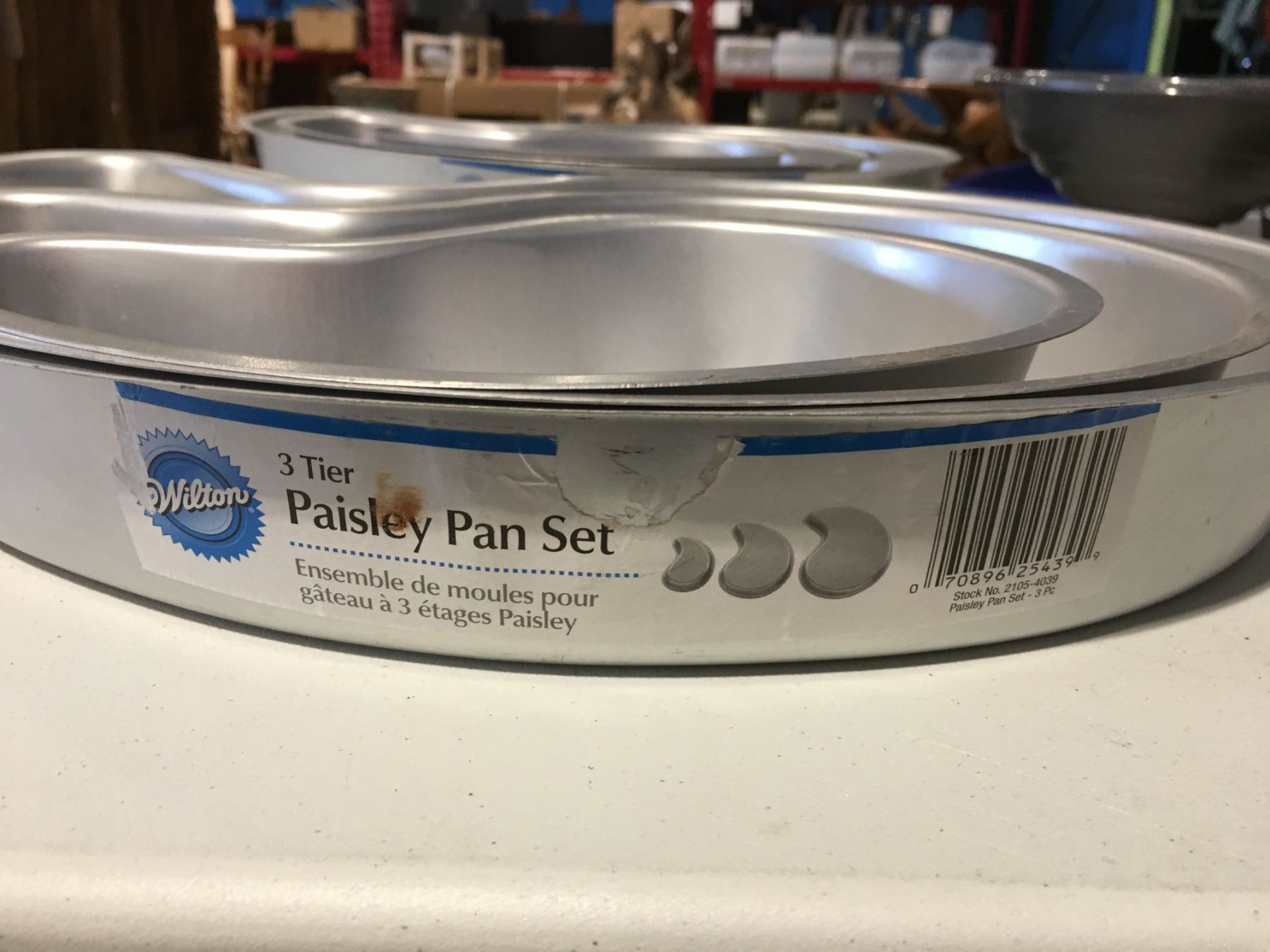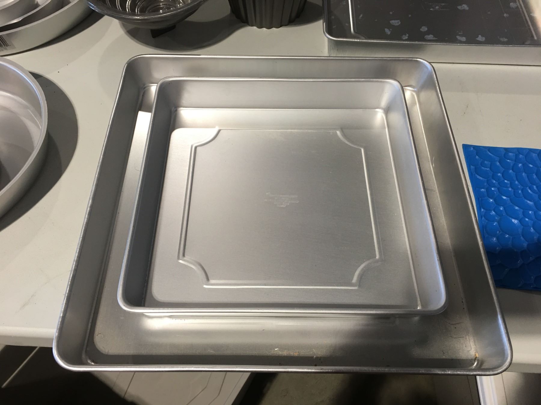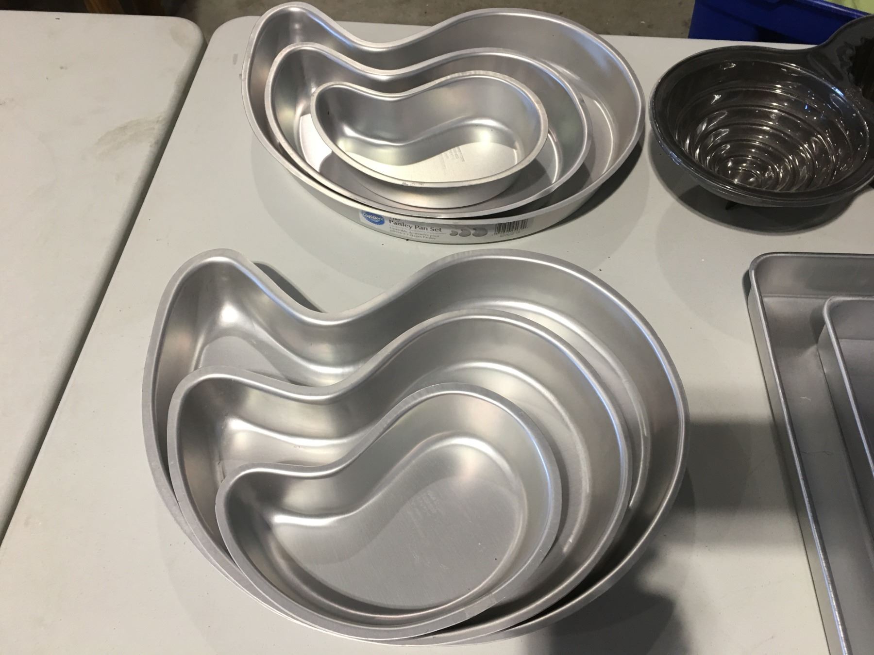 LOT OF ASSTD BAKE WARE INCLUDING - 2 X 3 PCE SET OF WILTON 3-TIER PAISLEY PAN SET 9"/12.5" & 16", SET OF SQUARE PANS 8", 12", 16", PLUS 11" X 15, 12" X 12", 16" X 16" PANS & SILICONE MOLDING PANEL & JUMBO CUPCAKE CAKE MOLD