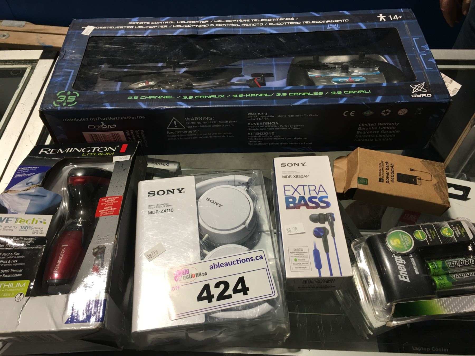LOT OF ASSTD ITEMS - REMOTE HELICOPTER/SHAVER/SONY HEADSET/BATTERY CHARGER ETC.