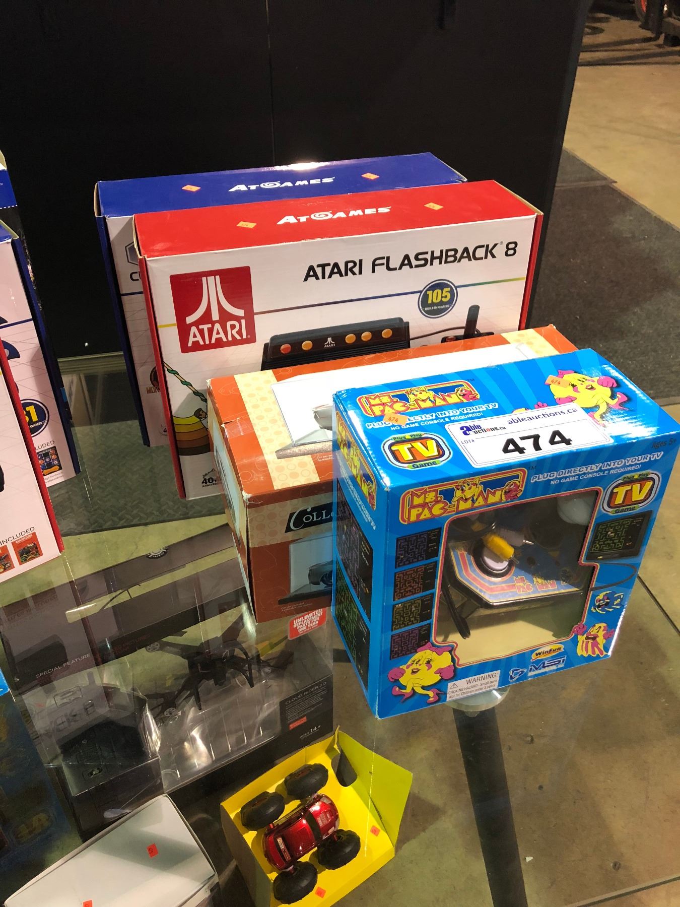 LOT OF: ATGAMES ATARI FLASHBACK 8, SEGA GENESIS CLASSIC GAME CONSOLE, MS. PAC-MAN PLUG&PLAY TV GAME & 13" X 5 1/2" X 5 3/8" DISPLAY CASE