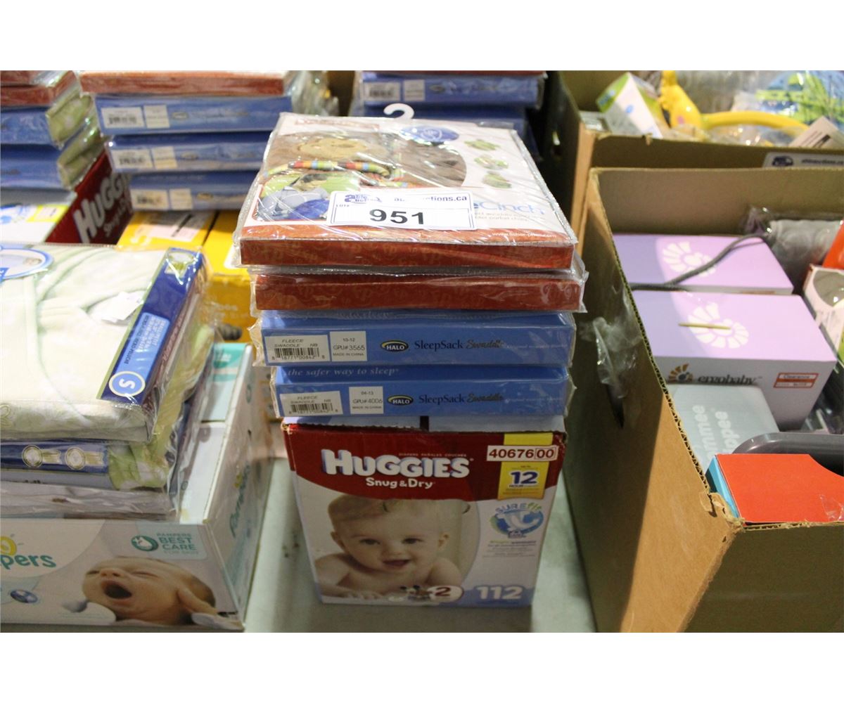 LOT OF BABY DIAPERS, SWADDLES, AND SLEEP SETS