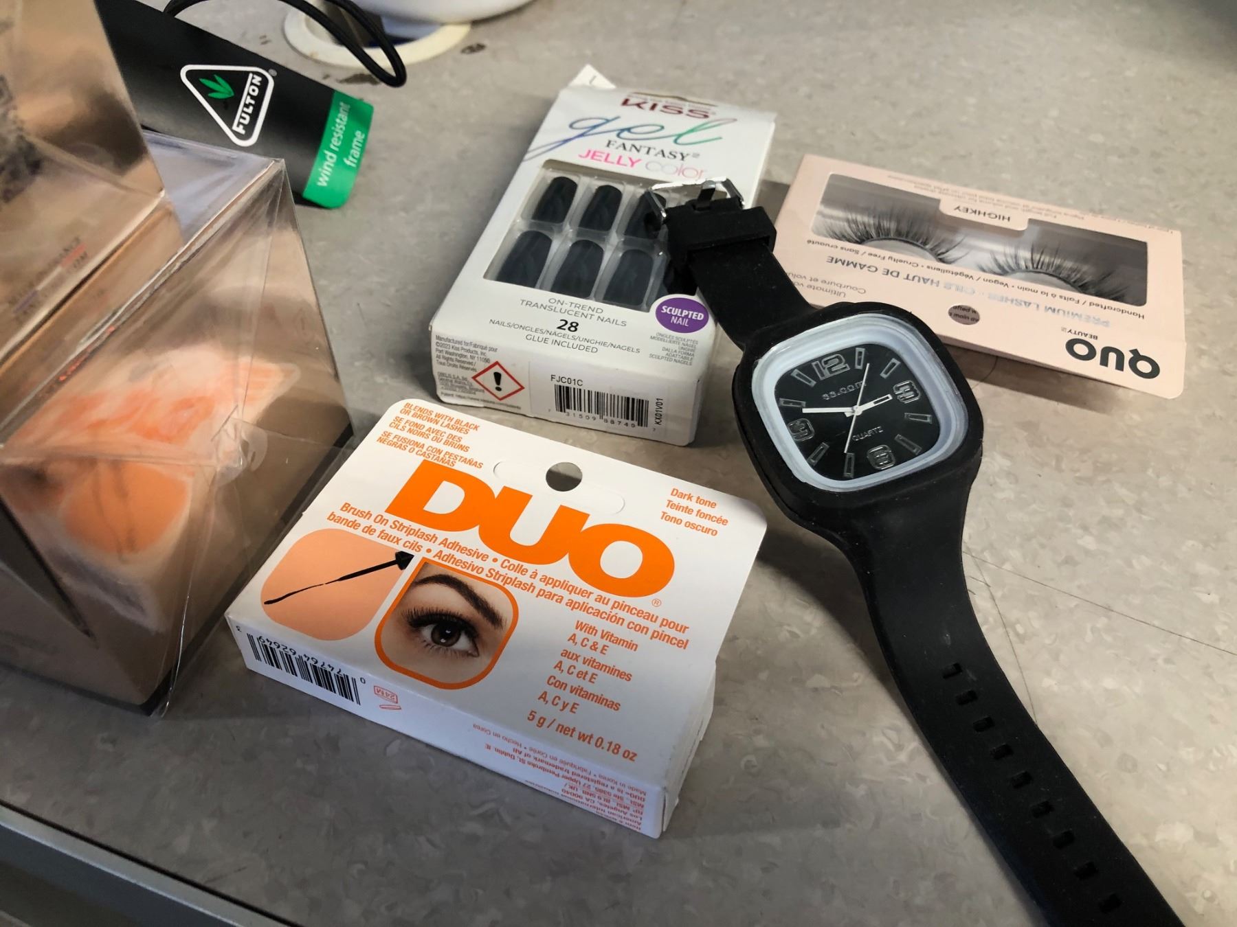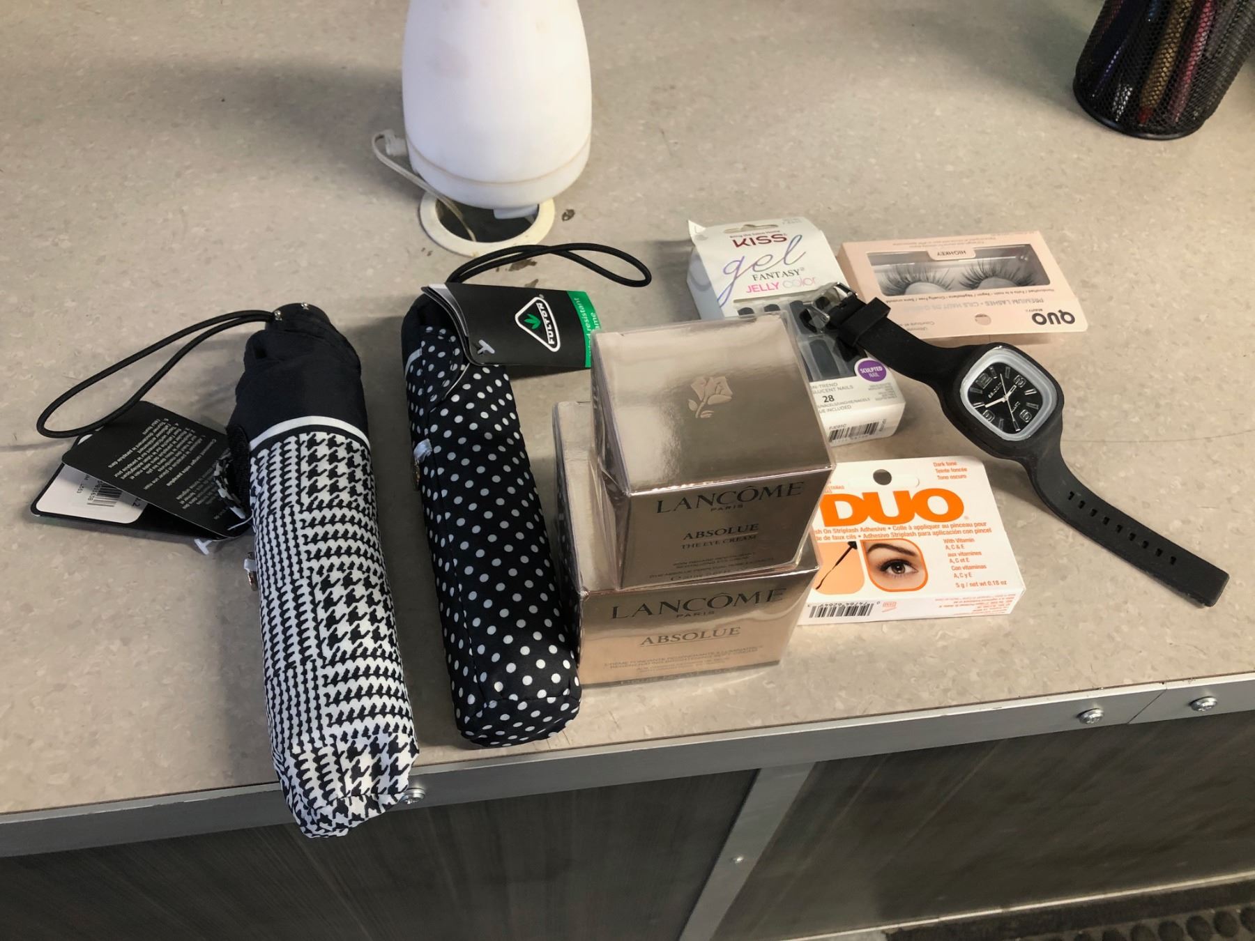 LOT OF BEAUTY PRODUCTS INCLUDING LANCOME PRODUCTS, UMBRELLAS ETC.