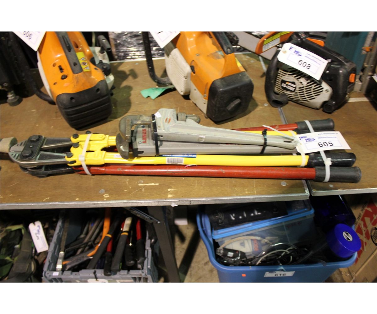 LOT OF BOLT CUTTERS, PIPE WRENCHES AND AXES