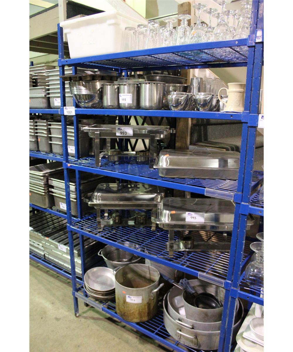 LOT OF CHAFING DISHES, POTS AND GLASSWARE