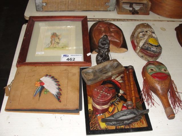 LOT OF COLLECTABLE NATIVE ITEMS; PICTURE, RATTLE, MASK, CARVING ETC