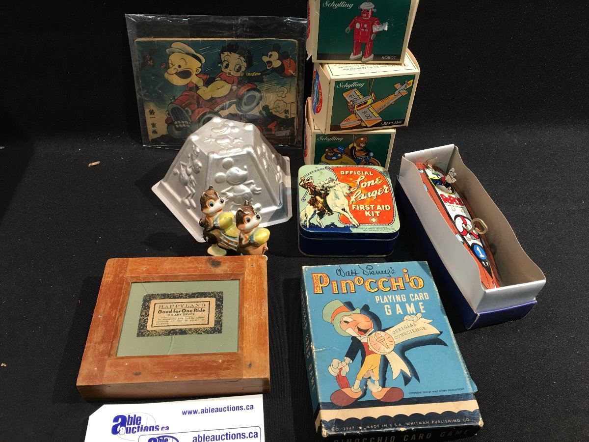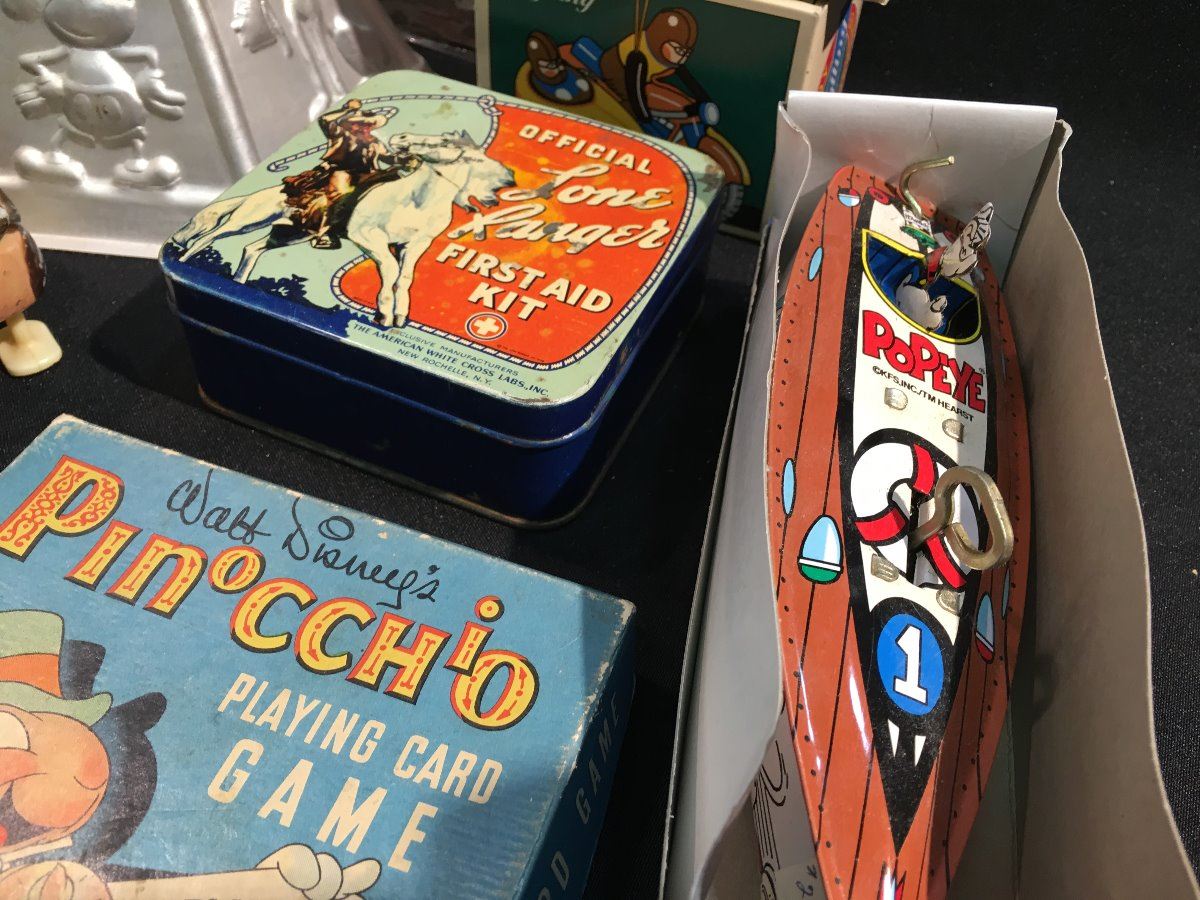 LOT OF DISNEY COLLECTABLES INC; POPEYE SPEED BOAT, JELLY MOLD, PINNOCHIO CARD GAME AND EARLY 1930'S TICKET TO HAPPY LAND