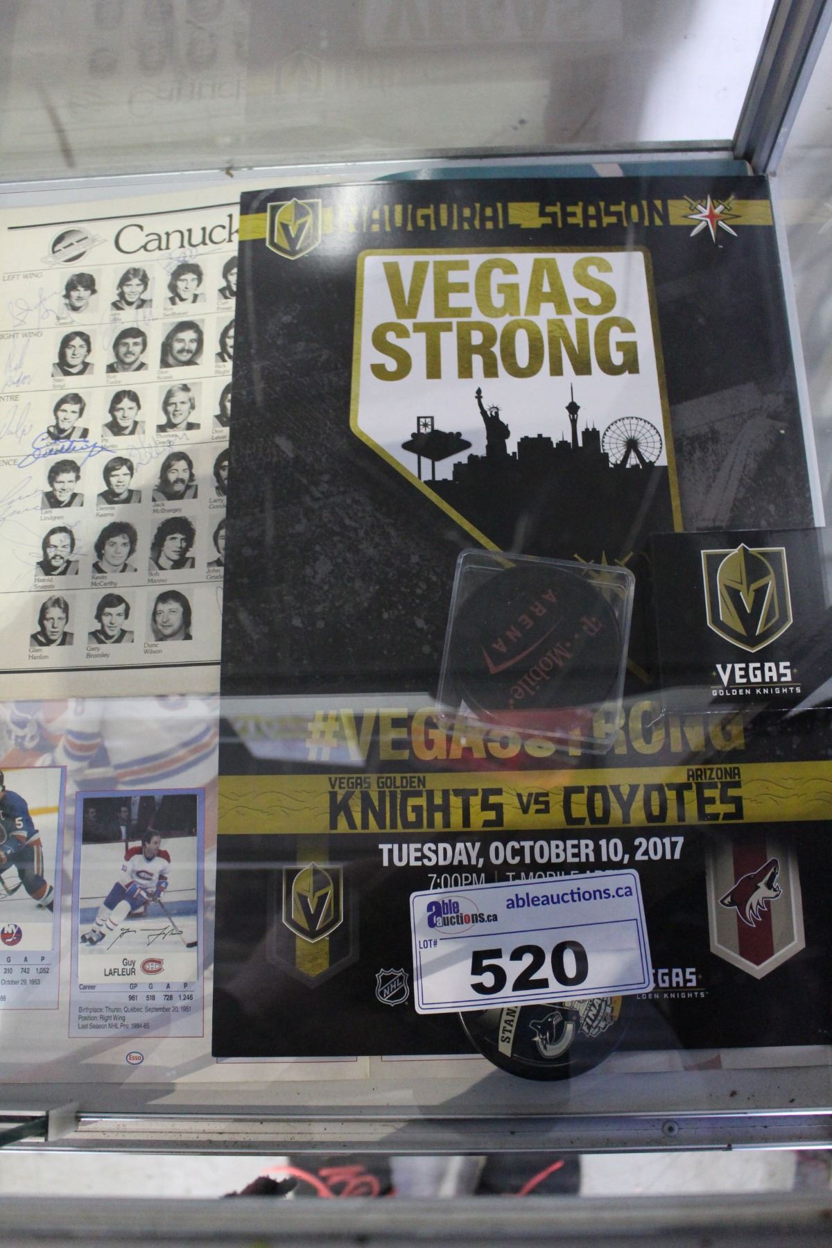 LOT OF HOCKEY COLLECTABLES - LAS VEGAS GOLDEN NIGHTS POSTER AND PUCK, AUTOGRAPHED PUCK BY BOSTON COACH 2011 FINALS