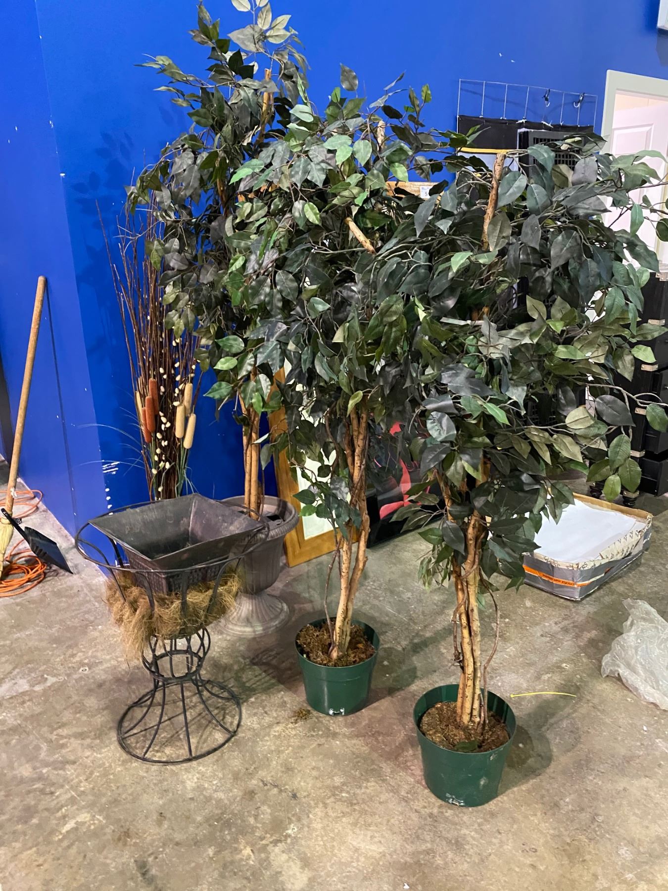 LOT OF HOME DECOR PLANTER STAND, 3 ARTIFICIAL TREES AND BULRUSHES