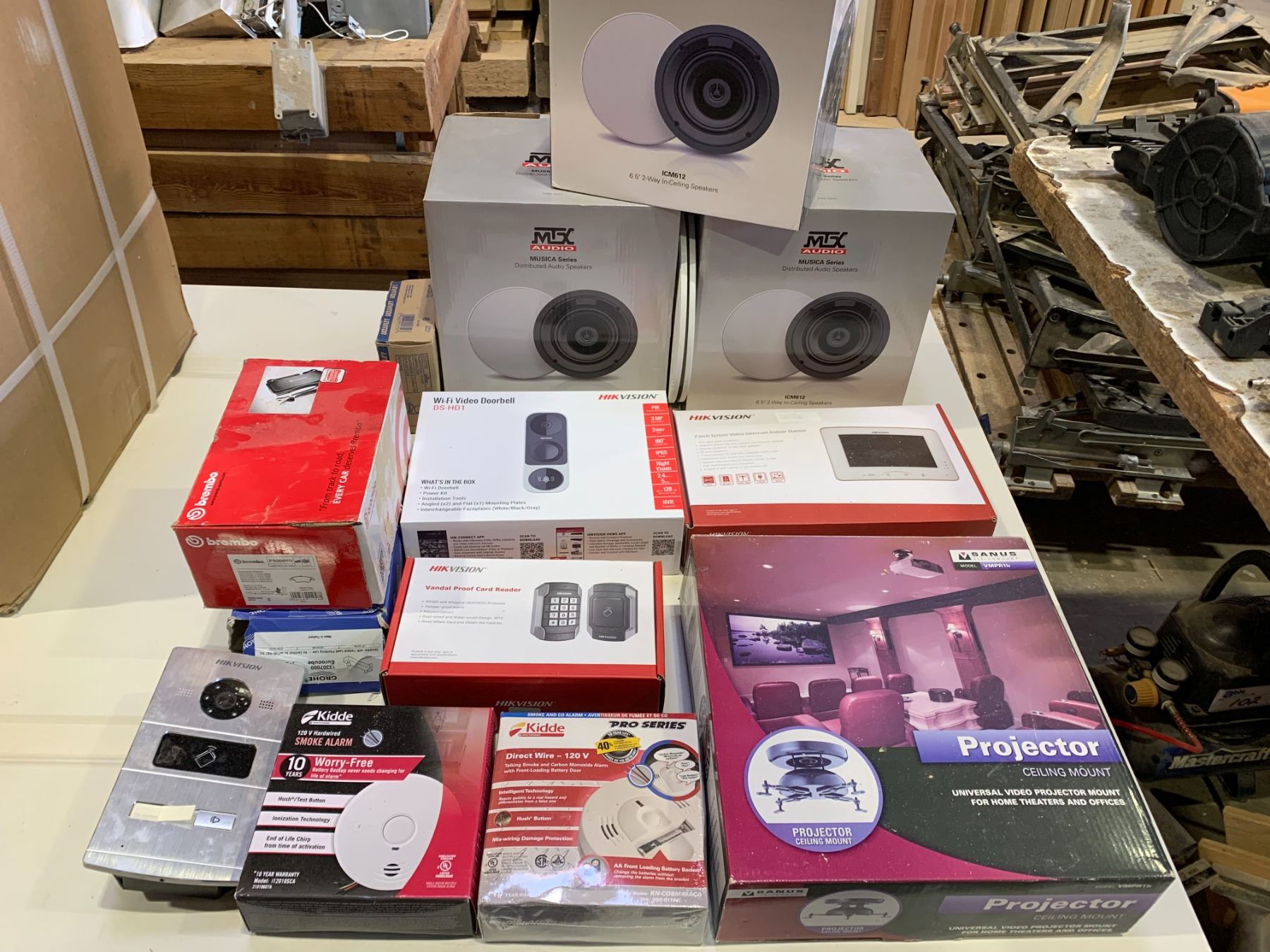LOT OF HOME GOODS - 3 MTX AUDIO SPEAKERS, WIFI DOORBELL, DOOR INTERCOM UNIT, DOOR CARD READER, 2 SMOKE ALARMS SANUS PROJECTOR CEILING MOUNT