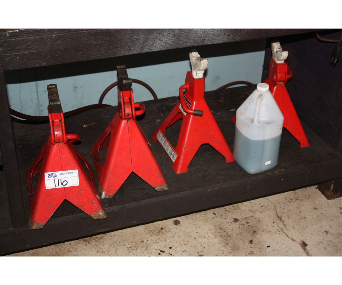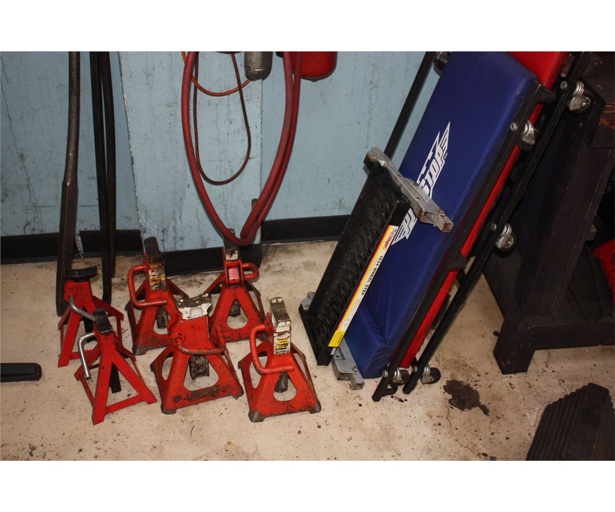 LOT OF JACK STANDS INC. 6 LARGE AND 6 SMALL, PLUS 3 DOLLIES