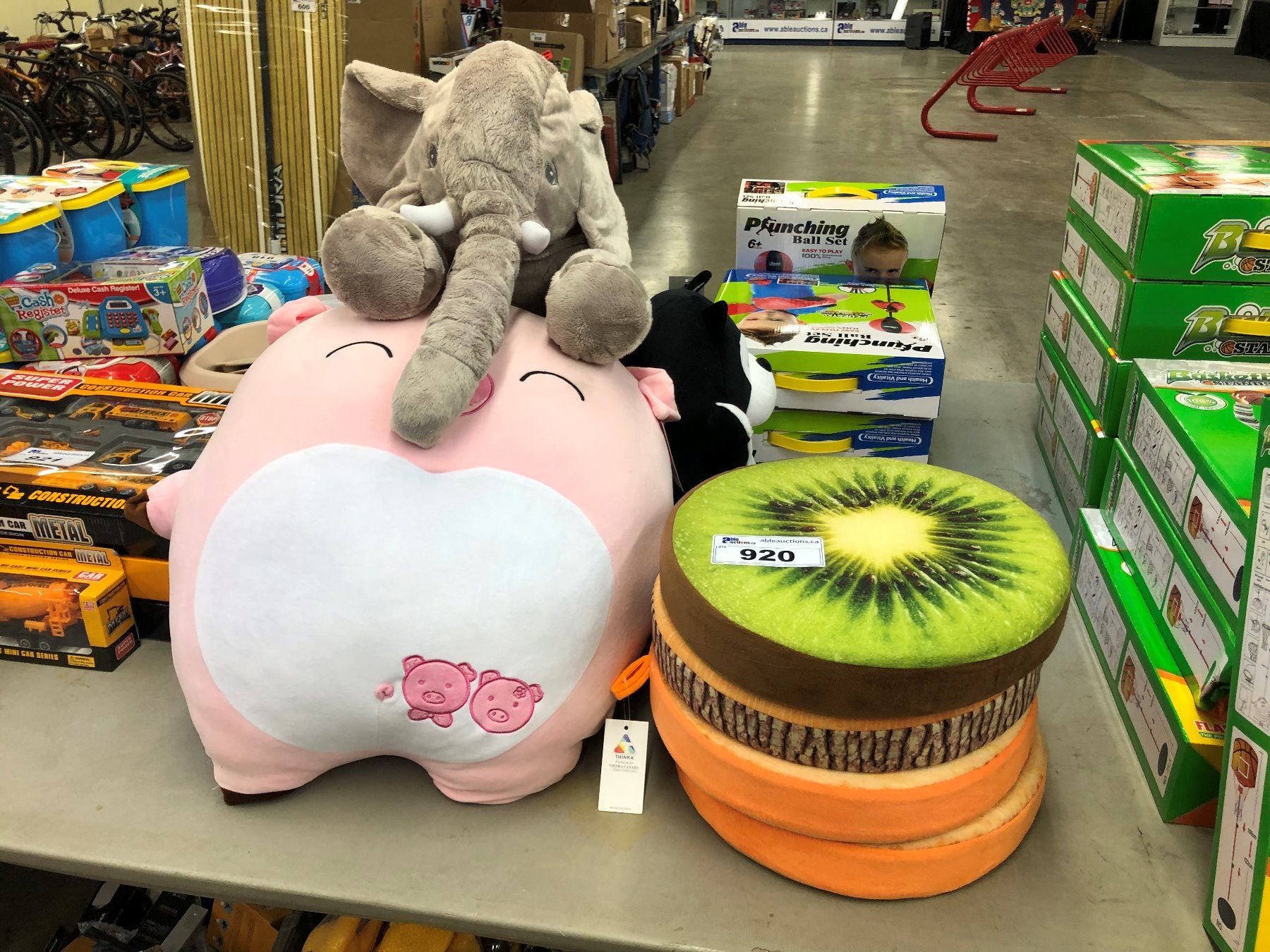 LOT OF LARGE STUFFED ANIMALS AND CUSHIONS