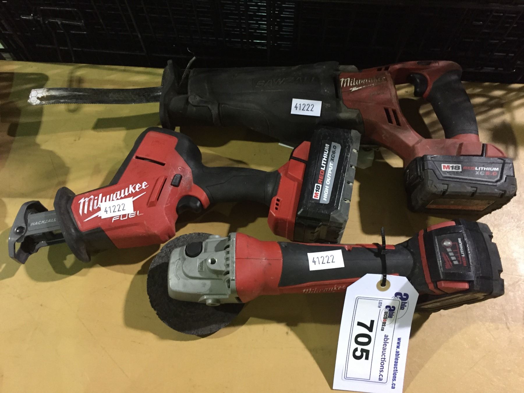 LOT OF MILWAUKEE M18 CORDLESS POWER TOOLS INCLUDING, GRINDER, HACKZALL, SAWZALL, AND 3 BATTERIES