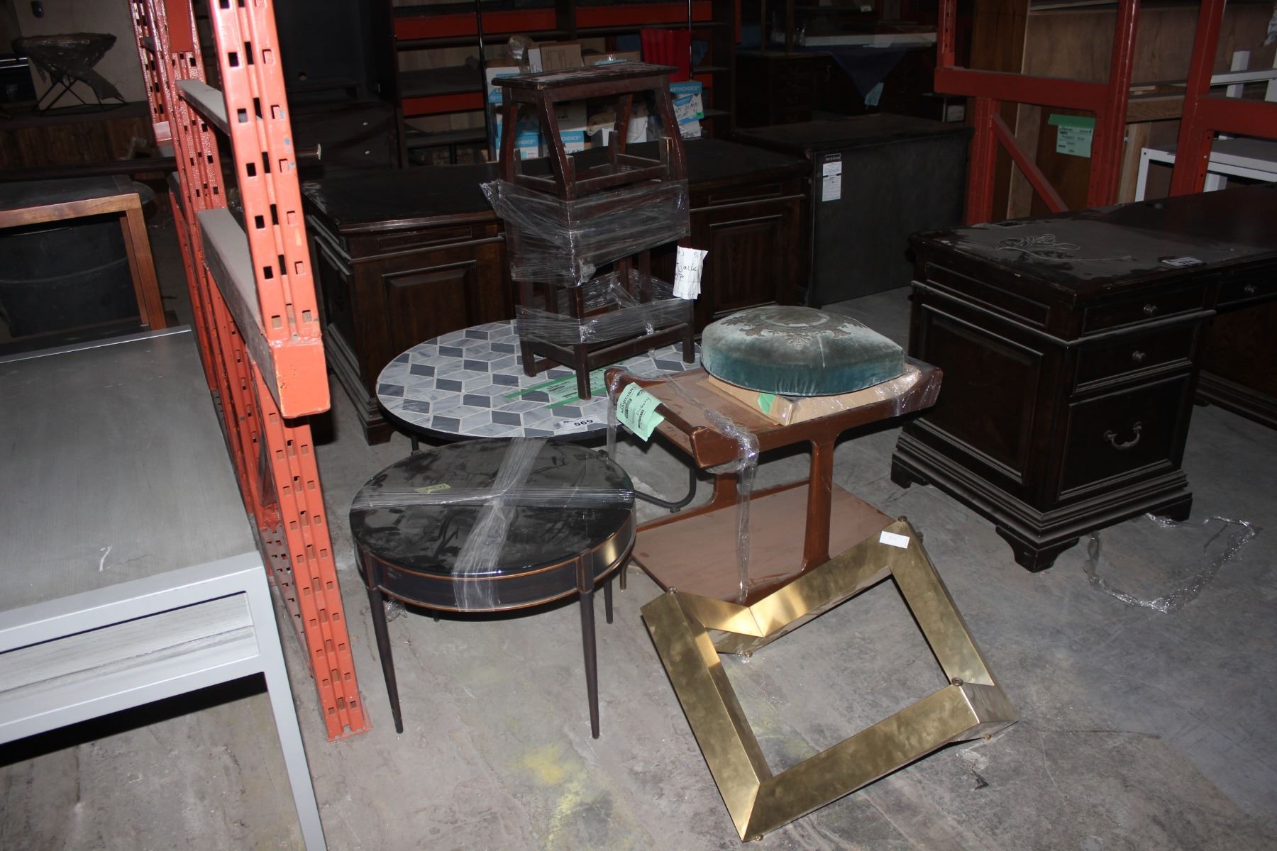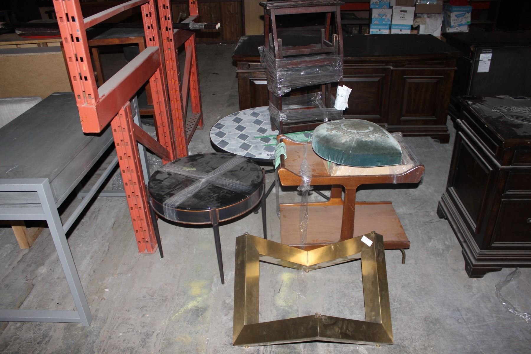 LOT OF MISC FURNITURE ITEMS INCLUDING COFFEE TABLE, ROLLING STAND, METAL BASE, ROUND TABLE AND MORE