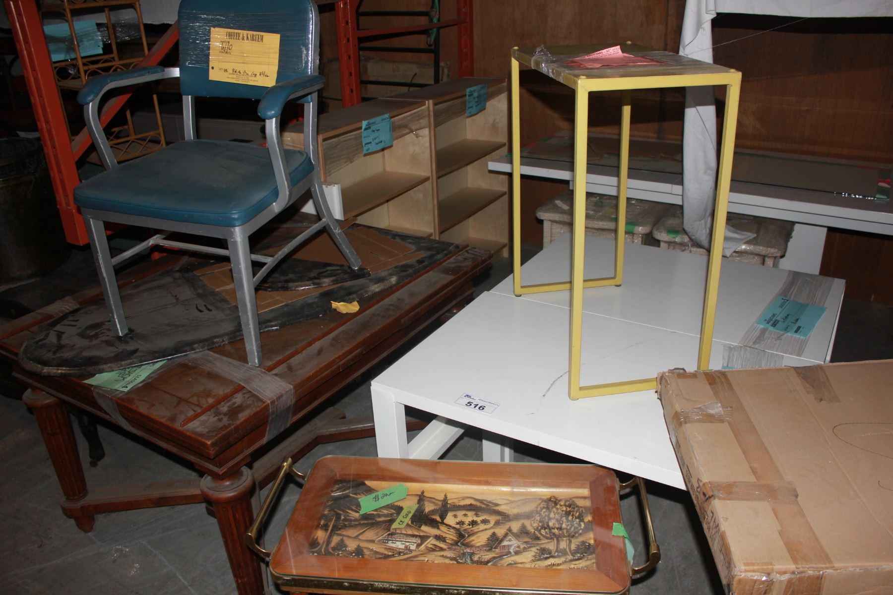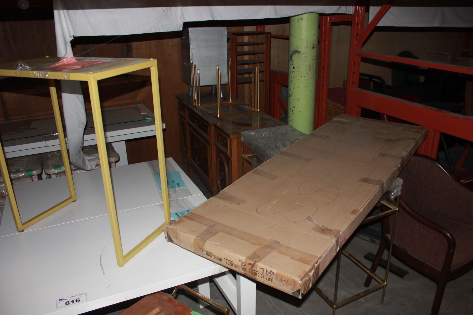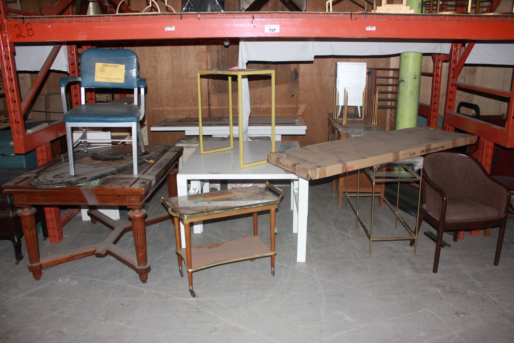 LOT OF MISC FURNITURE UNDER PALLET RACKING