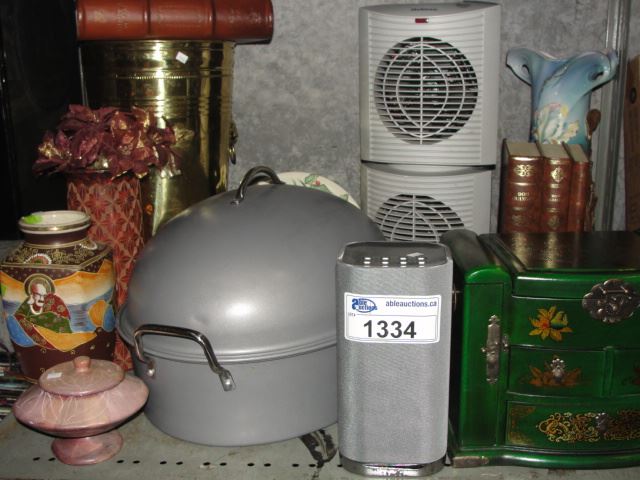 LOT OF MISC HOUSHEOLD ITEMS; JEWELLERY BOX, FAN, VASE, ETC