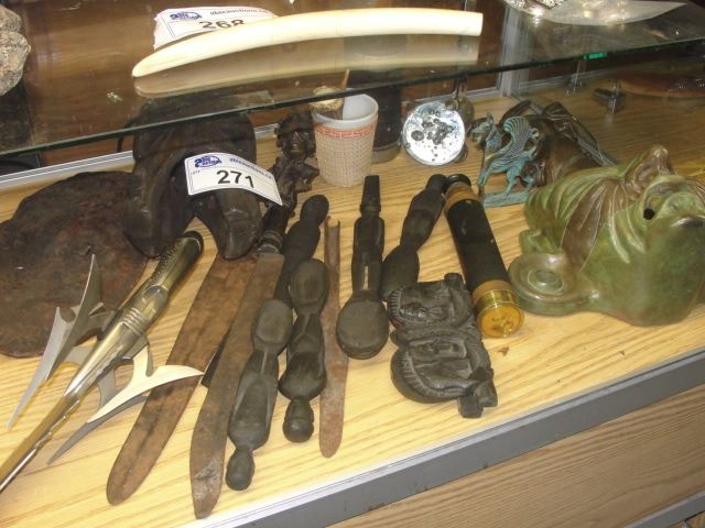 LOT OF MISC KNIVES; DAGGER, MASKS, SPOONS, TELESCOPE AND MISC SOUTH AMERICAN ITEMS