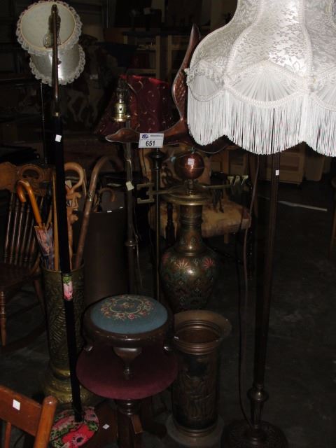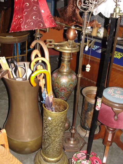 LOT OF MISC LAMPS, WEATHER VANE, VASES, STOOLS AND CANES