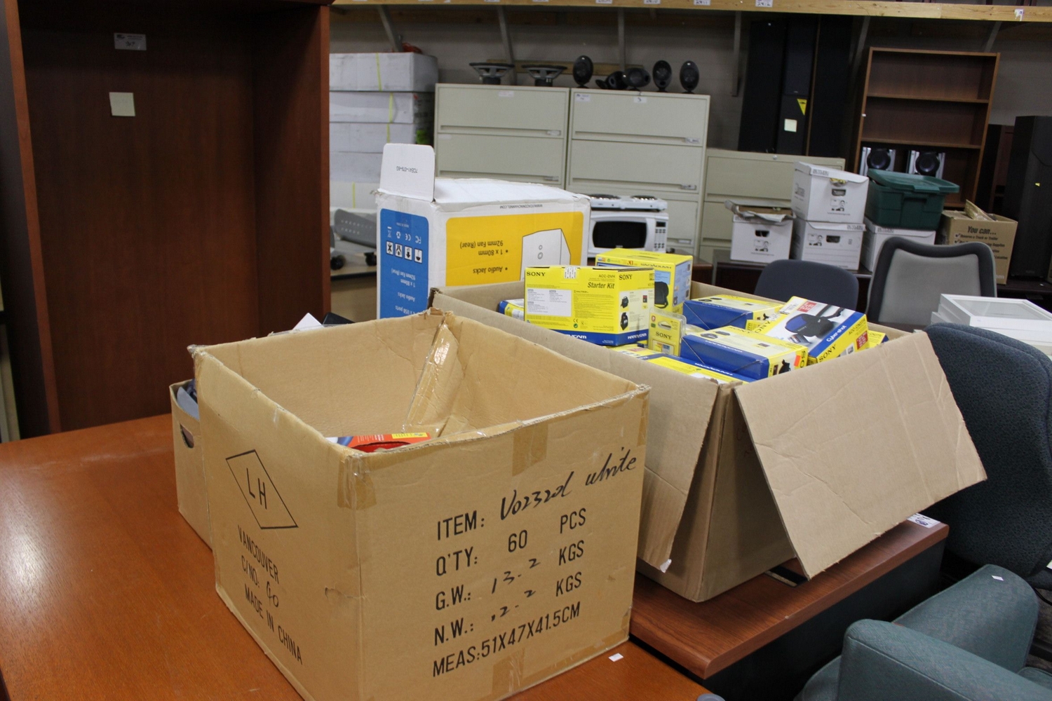 LOT OF MISC OFFICE SUPPLIES & 2 DESKS