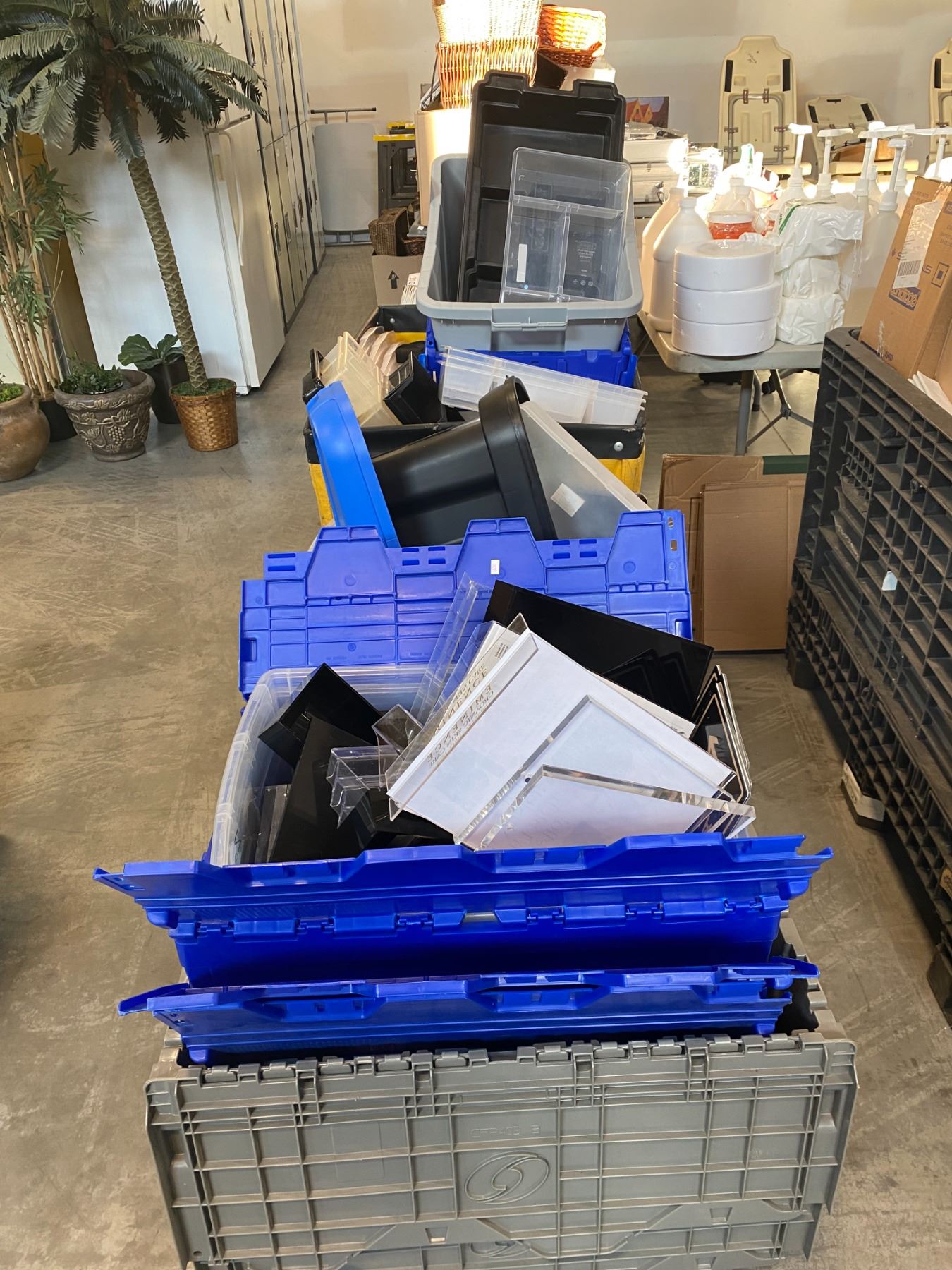 LOT OF MISC PLASTIC STORAGE BINS - YELLOW BIN NOT INCLUDED