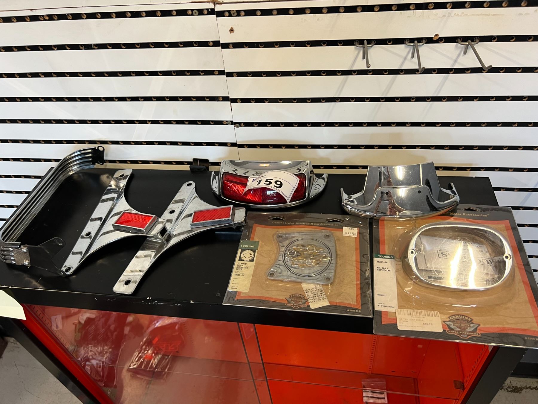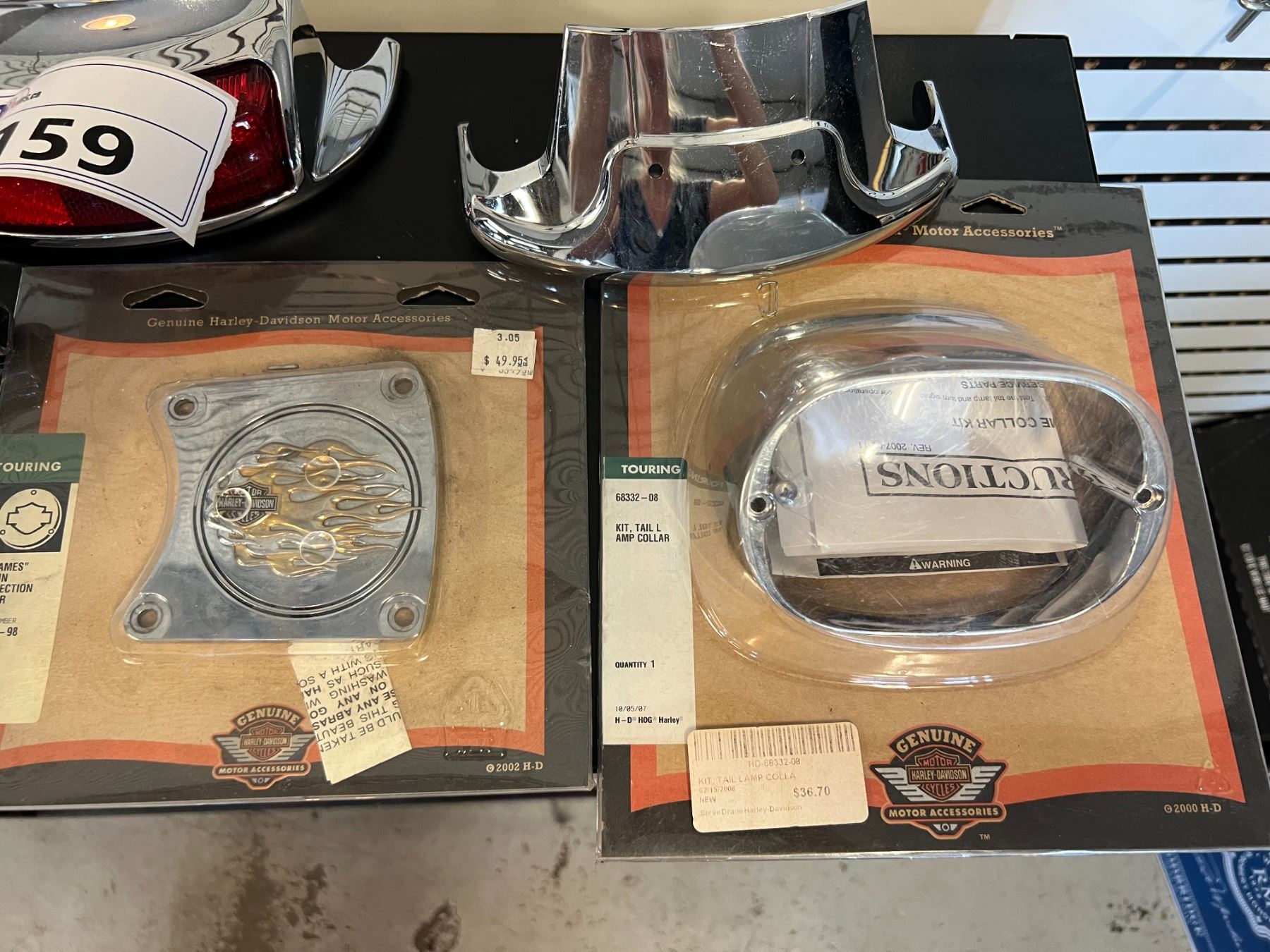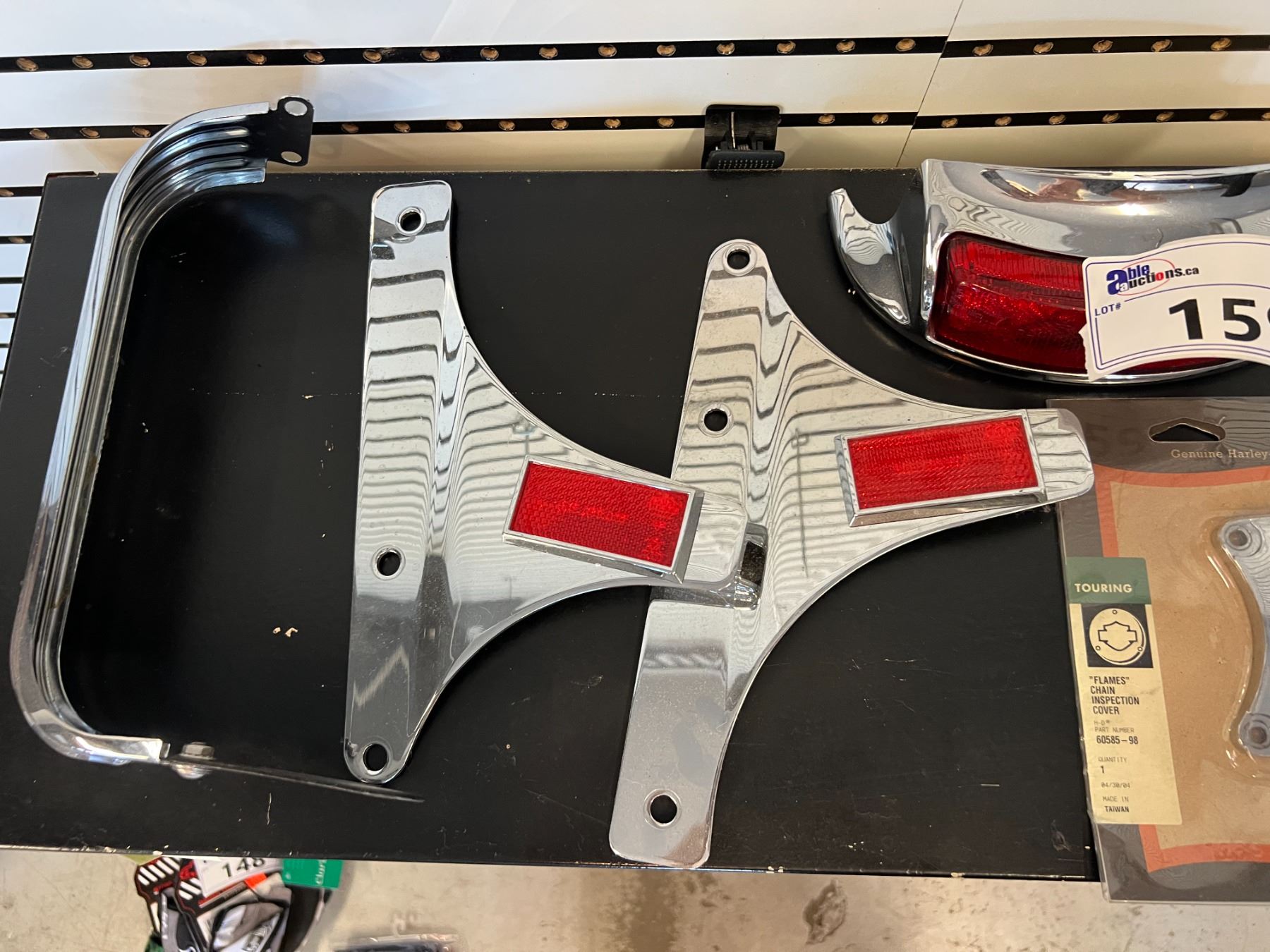 LOT OF MISCELLANEOUS HARLEY-DAVIDSON PARTS - SIDE PLATE, CHAIN INSPECTION COVER, TAIL LAMP COLLAR, TAIL LIGHT FOR TOURING MOTORCYCLES