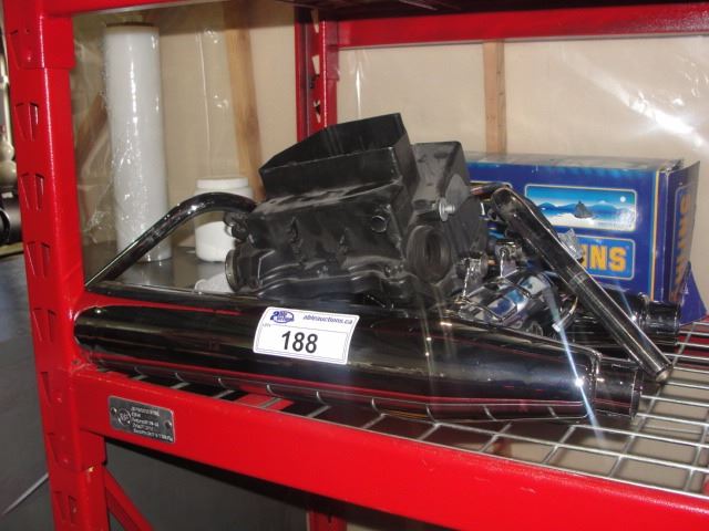 LOT OF MUFFLER, SHOCKS, HANDLE BARS AND OTHER MOTORCYCLE RELATED ITEMS