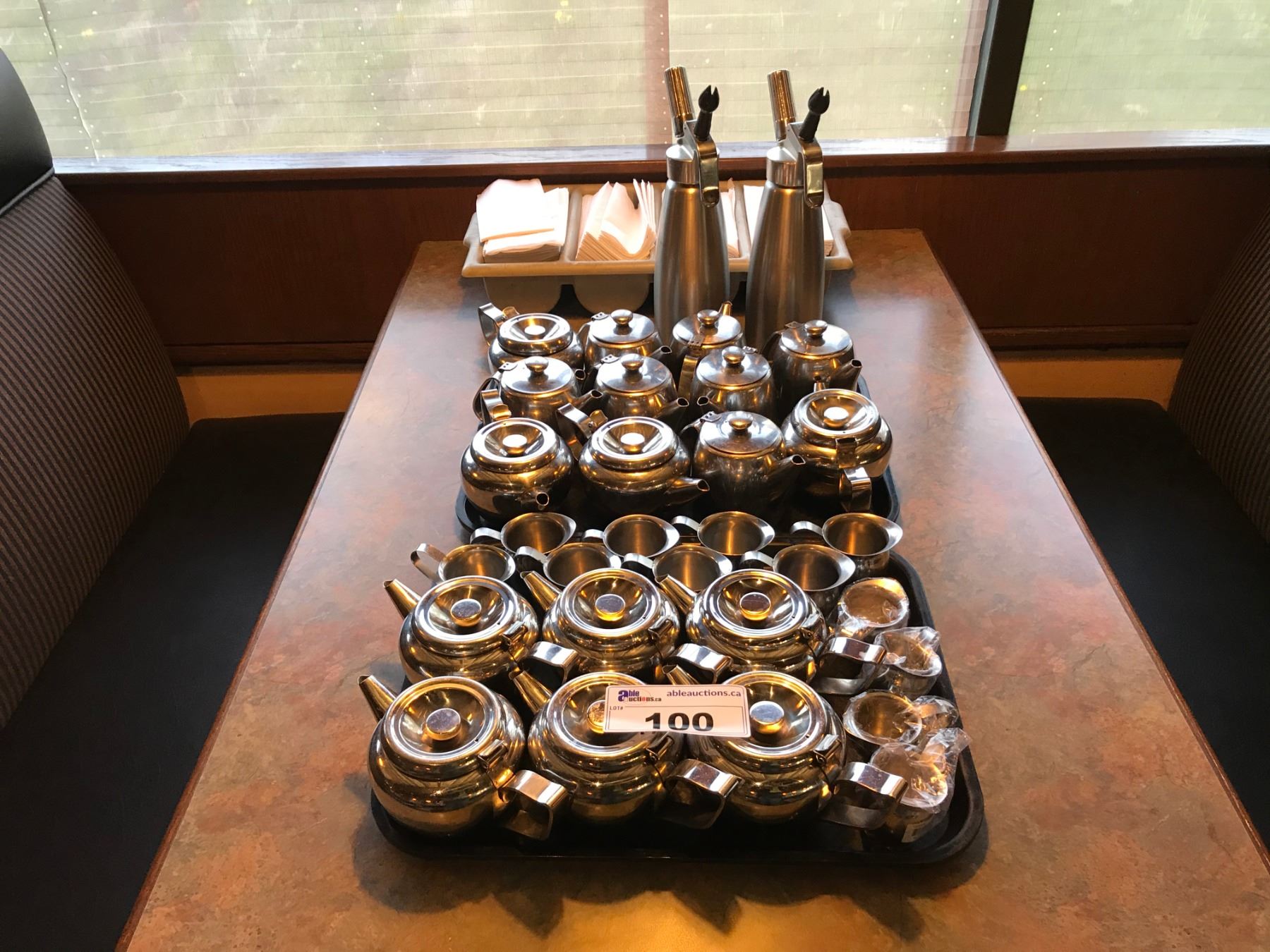 LOT OF NAPKINS, STAINLESS TEAPOTS, CREAMERS & WHIPPING CREAM DISPENSERS