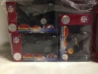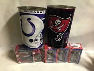 LOT OF NFL COLLECTABLES INC: INDY COLTS AND BUCCANEERS TRASH CANS, 3 DAVE CASPER (GREATEST OAKLAND RAIDER EVER) BOBBLE HEADS AND 3 NFL DIE CAST QUADS
