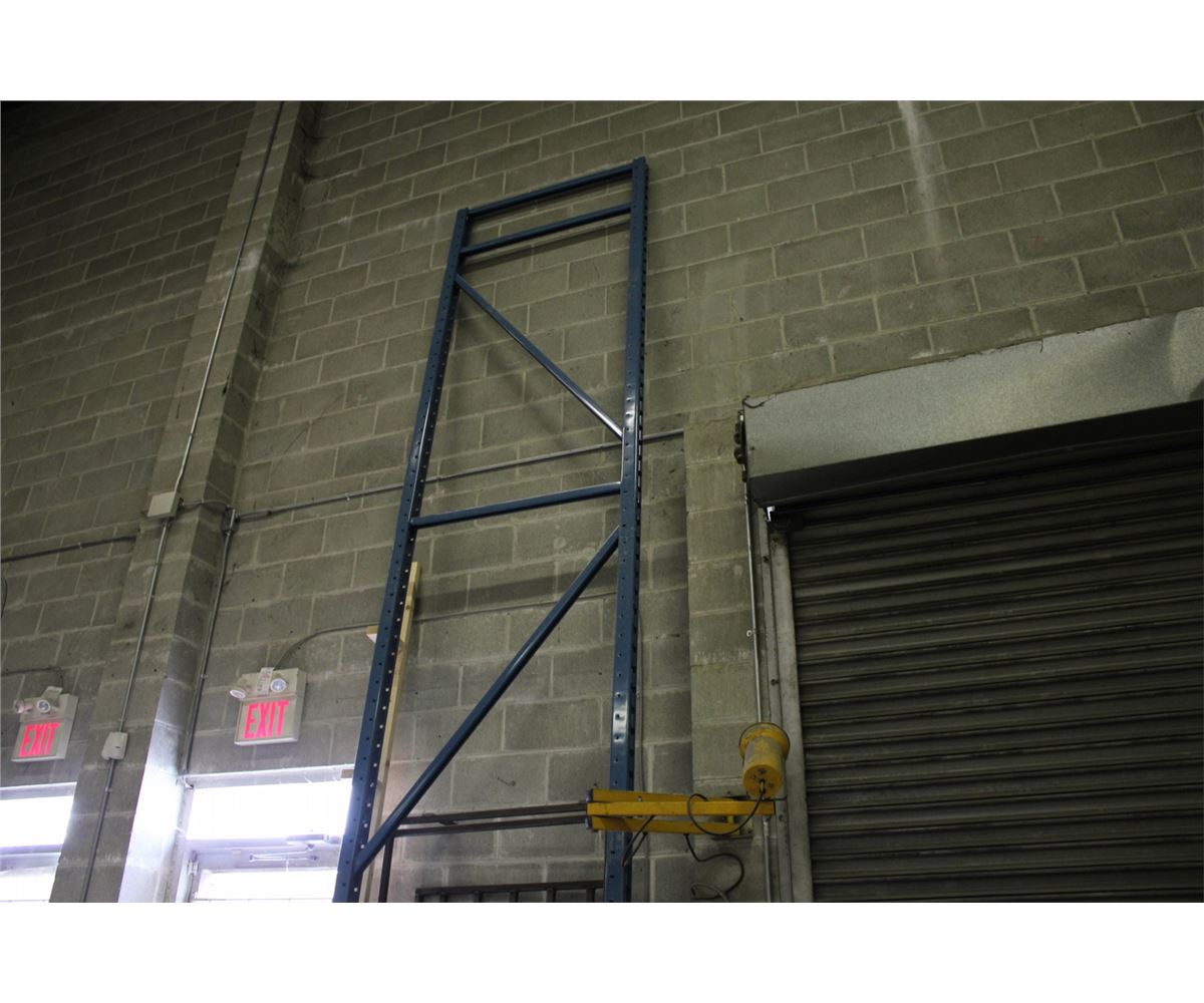 LOT OF PALLET RACKING INC. 7 ASSORTED BLUE UPRIGHTS AND ASSORTED CROSSBARS AND BLUE SAFETY RAILINGS