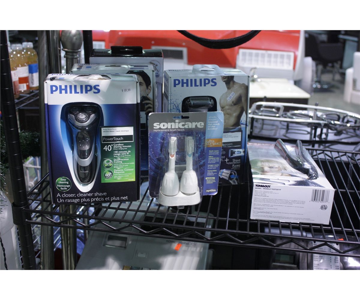 LOT OF PERSONAL SHAVERS, TOOTHBRUSH HEADS, AND STRAIGHTNER