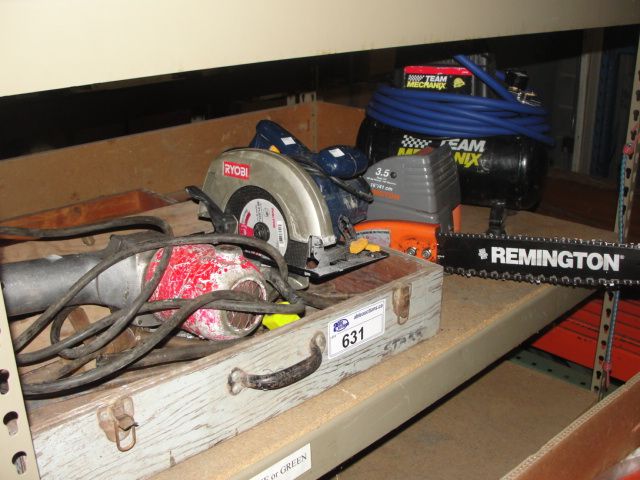 LOT OF POWER TOOLS; AIR COMPRESSOR, REMMINGTON CHAINSAW, RYOBI CIRCULAR SAW, ELECTRIC JACK HAMMER