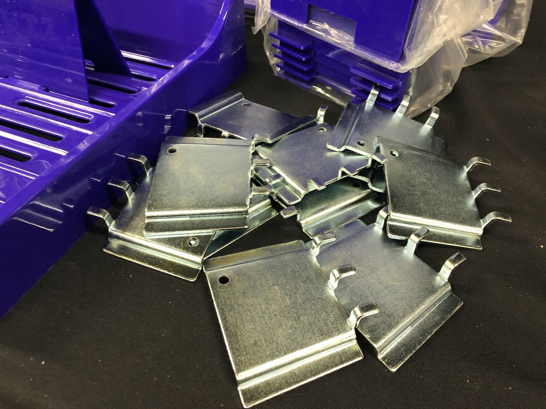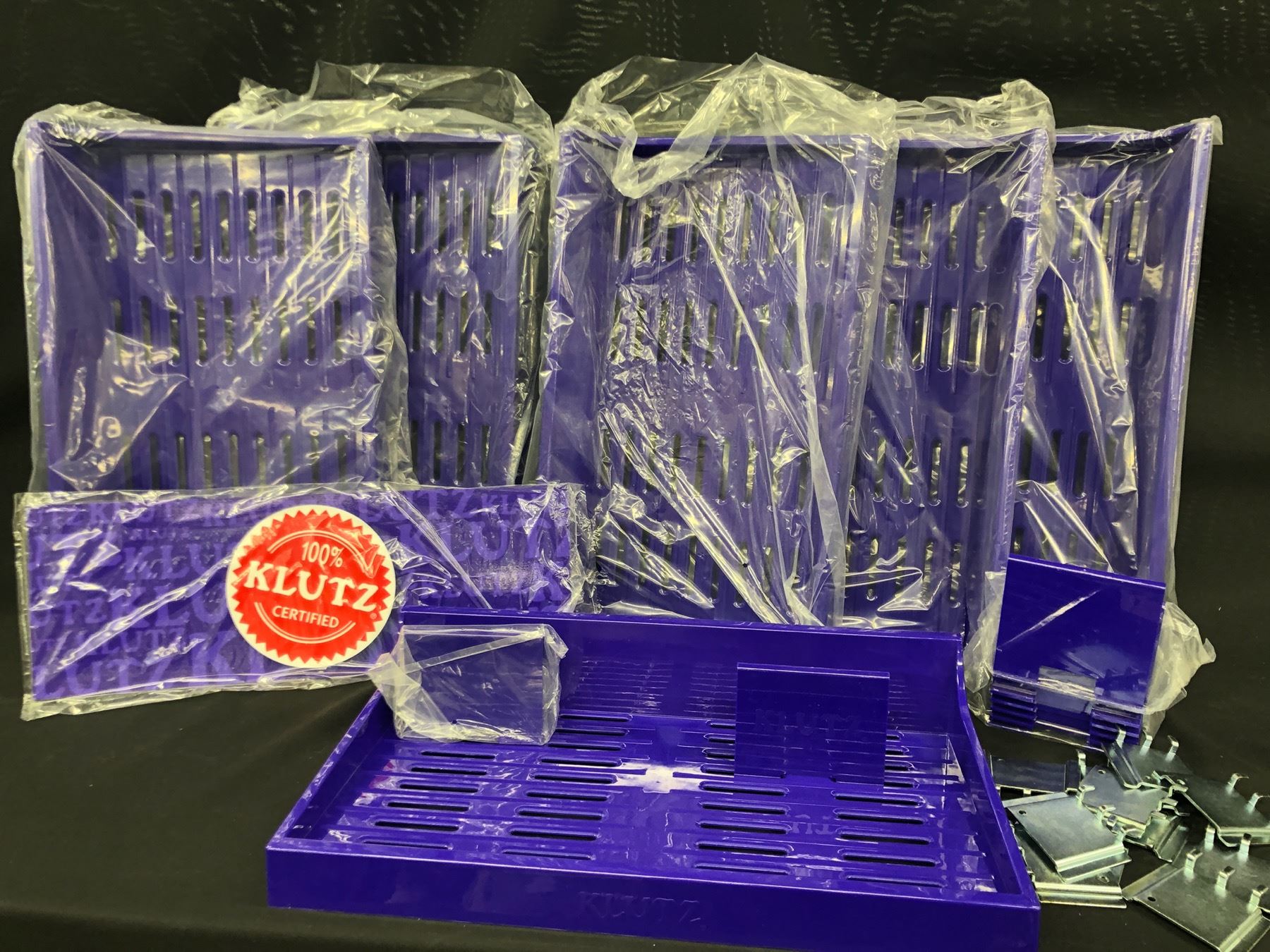 LOT OF PURPLE SLAT WALL ADJUSTABLE SHELVES WITH HOOKS AND DIVIDERS, 6 SHELVES IN TOTAL, 22 1/2  X