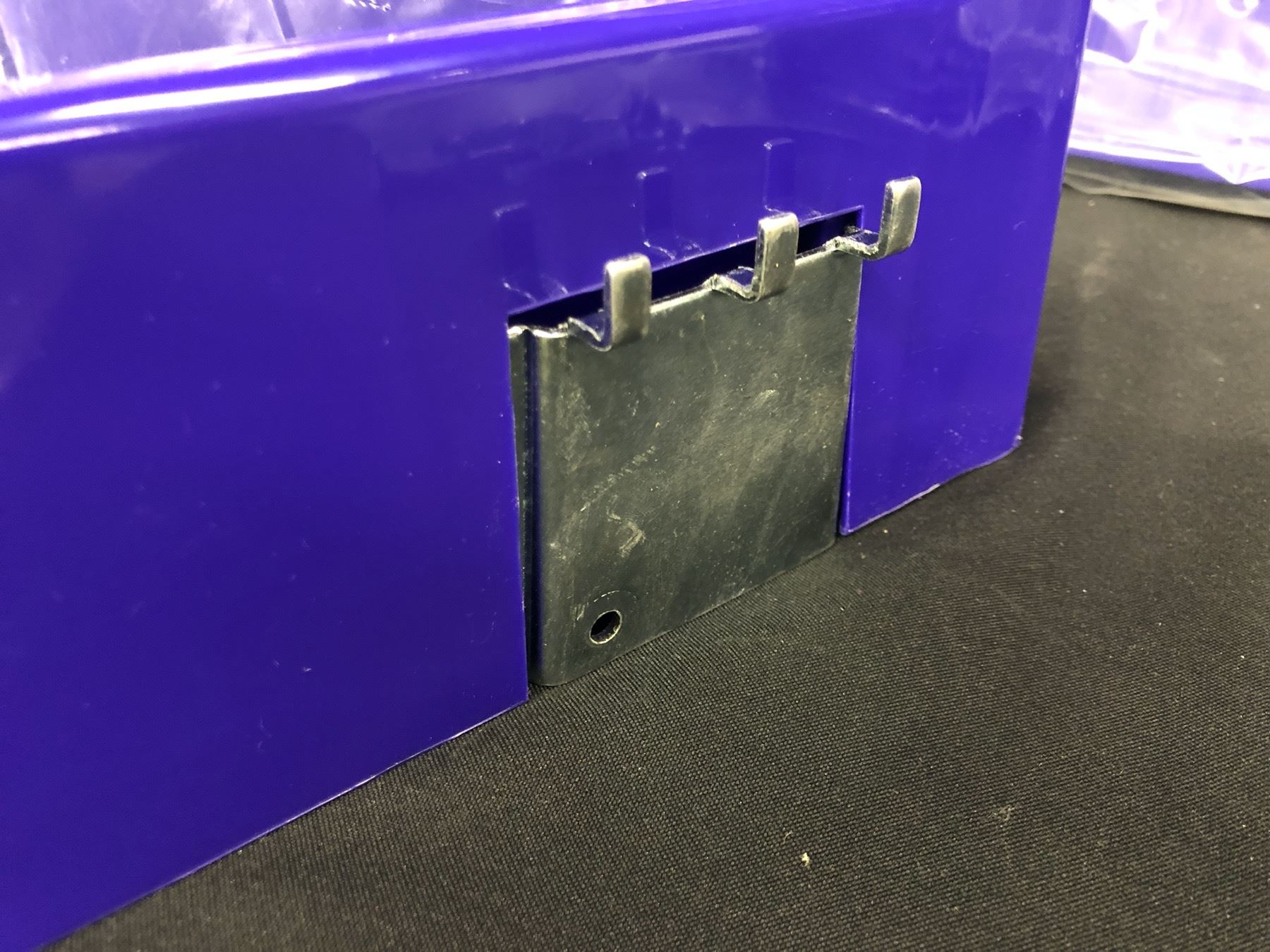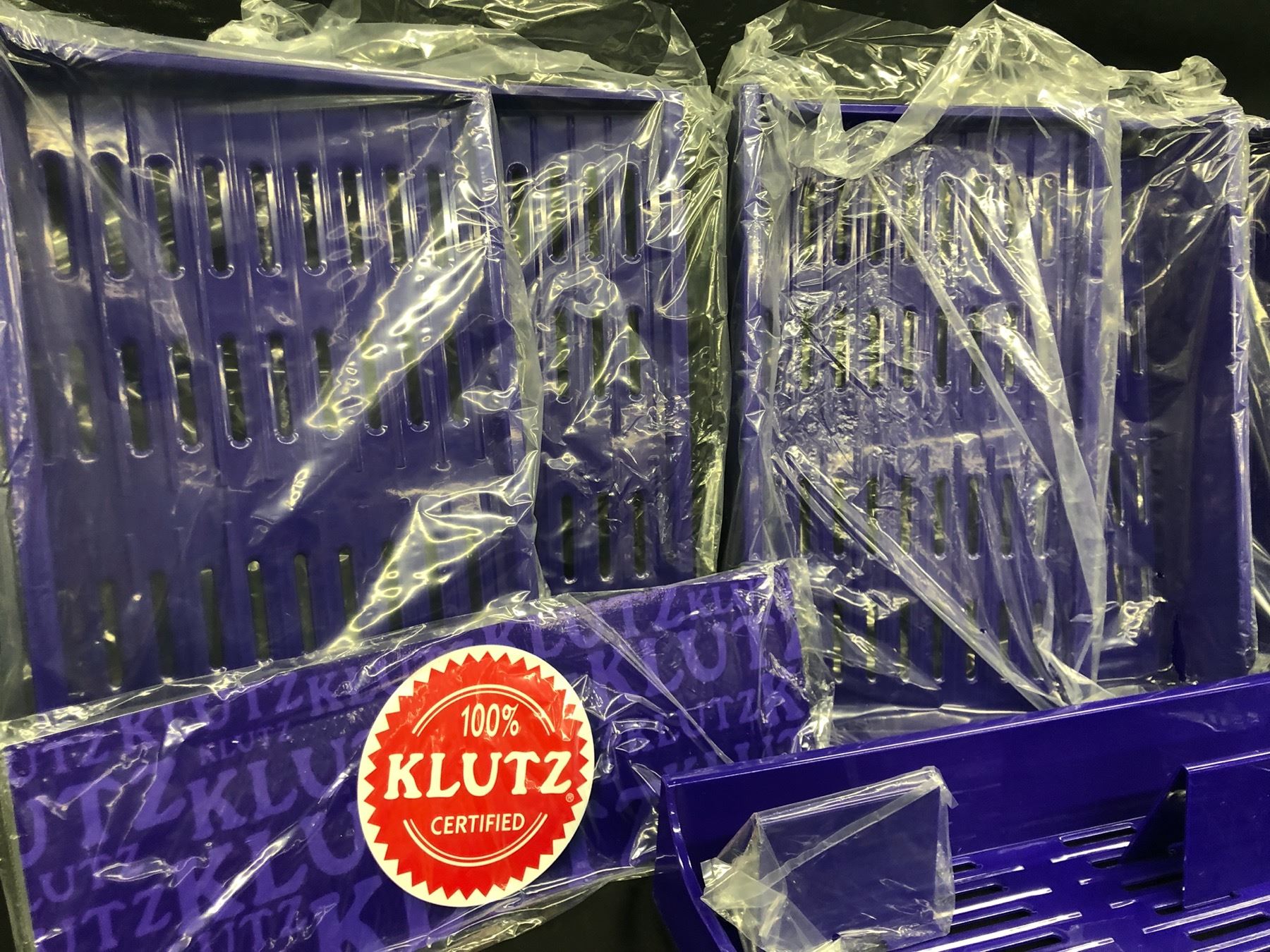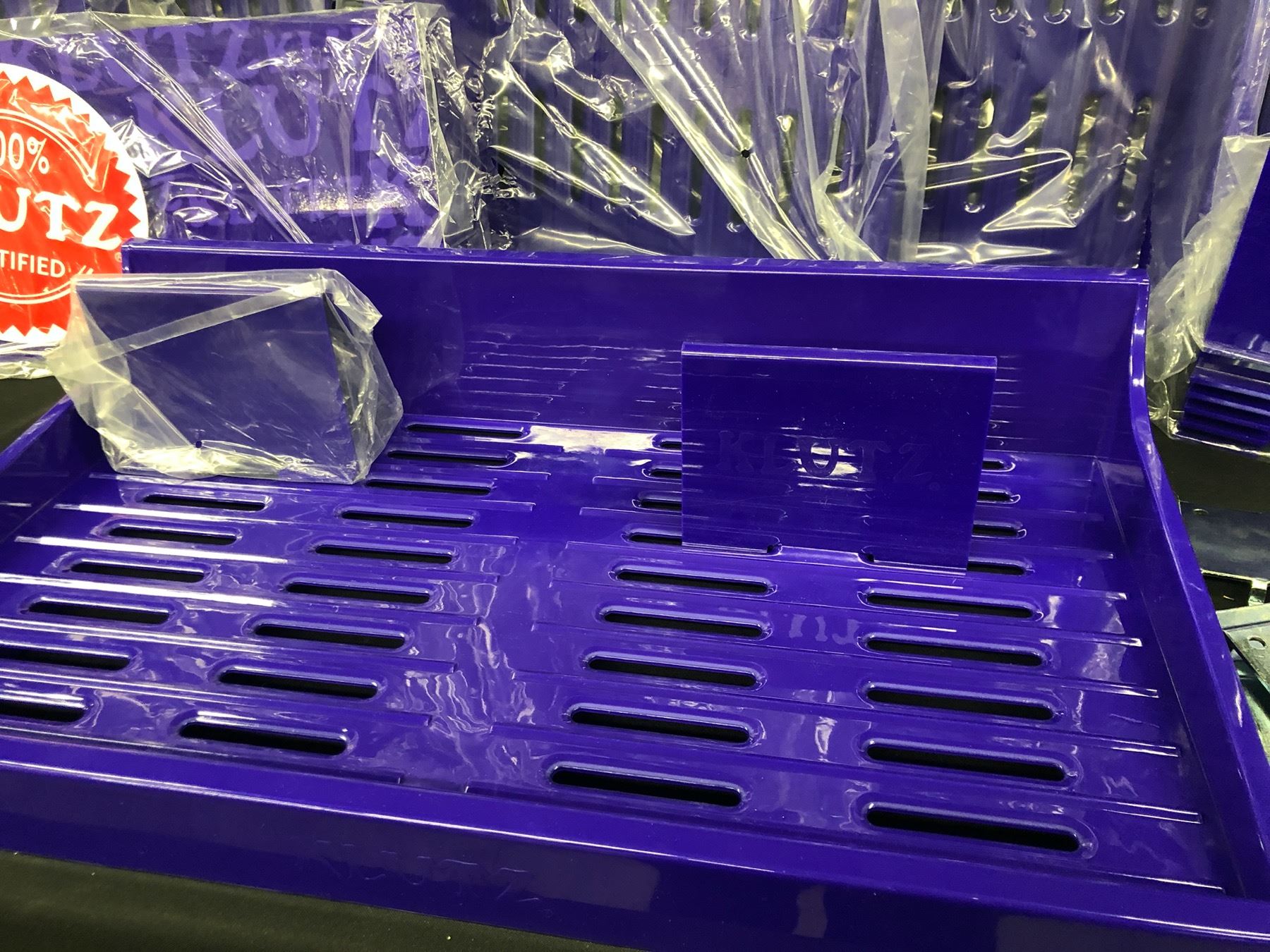 LOT OF PURPLE SLAT WALL ADJUSTABLE SHELVES WITH HOOKS AND DIVIDERS, 6 SHELVES IN TOTAL, 22 1/2" X