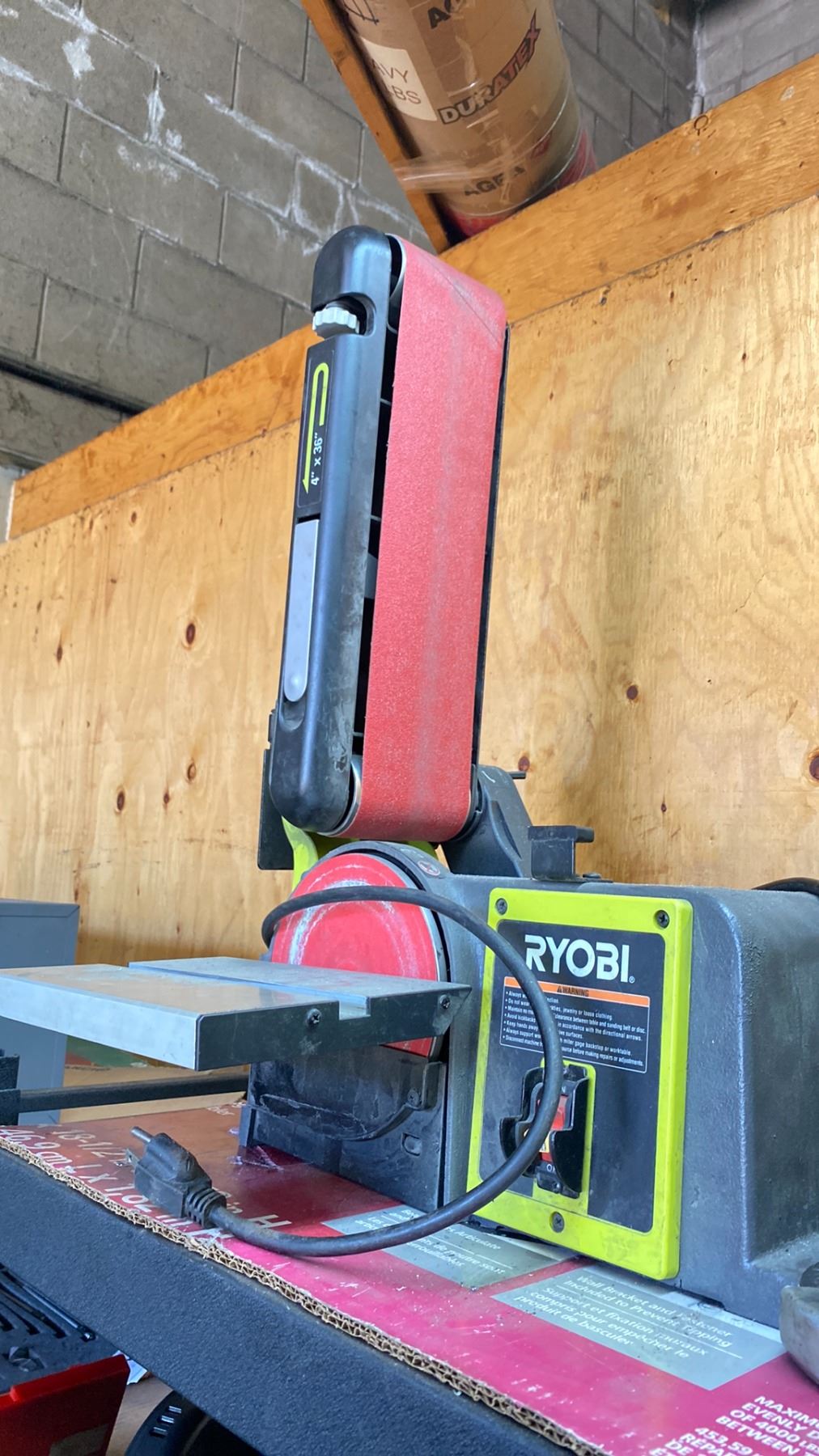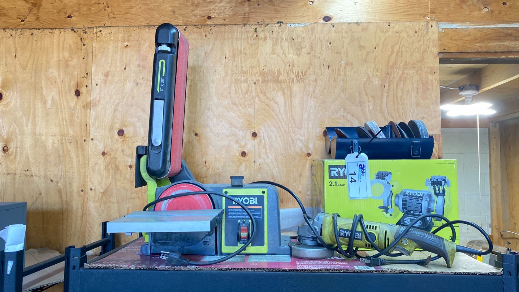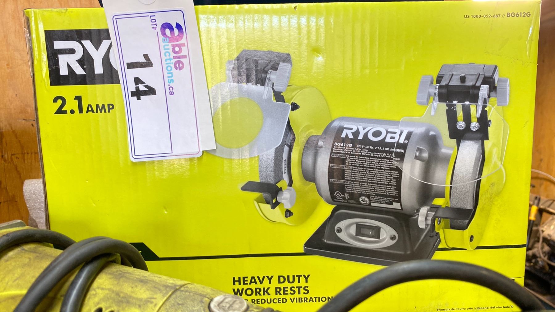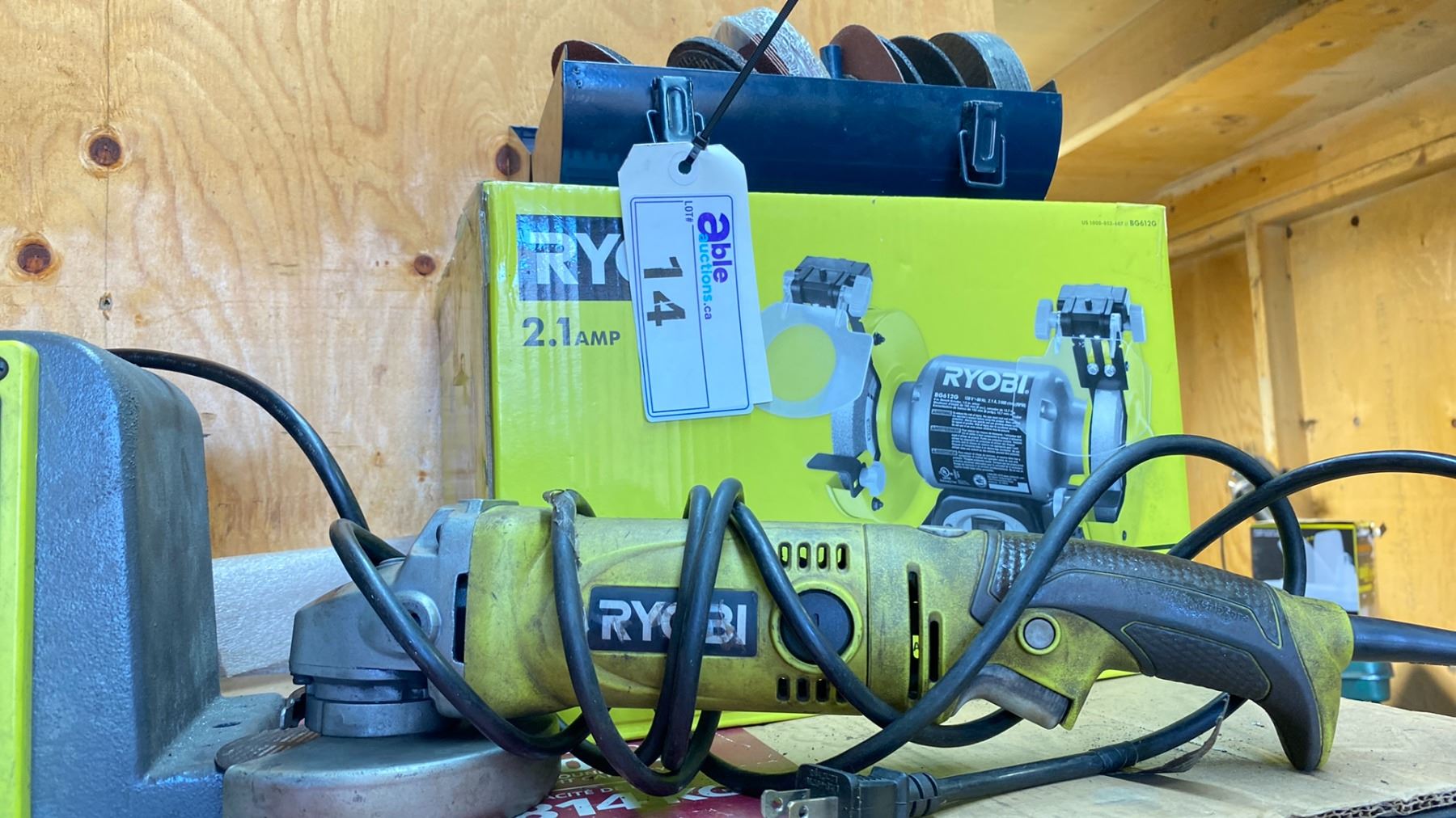 LOT OF RYOBI TOOLS, BENCH GRINDER, HAND GRINDER AND COMBINATION SANDER