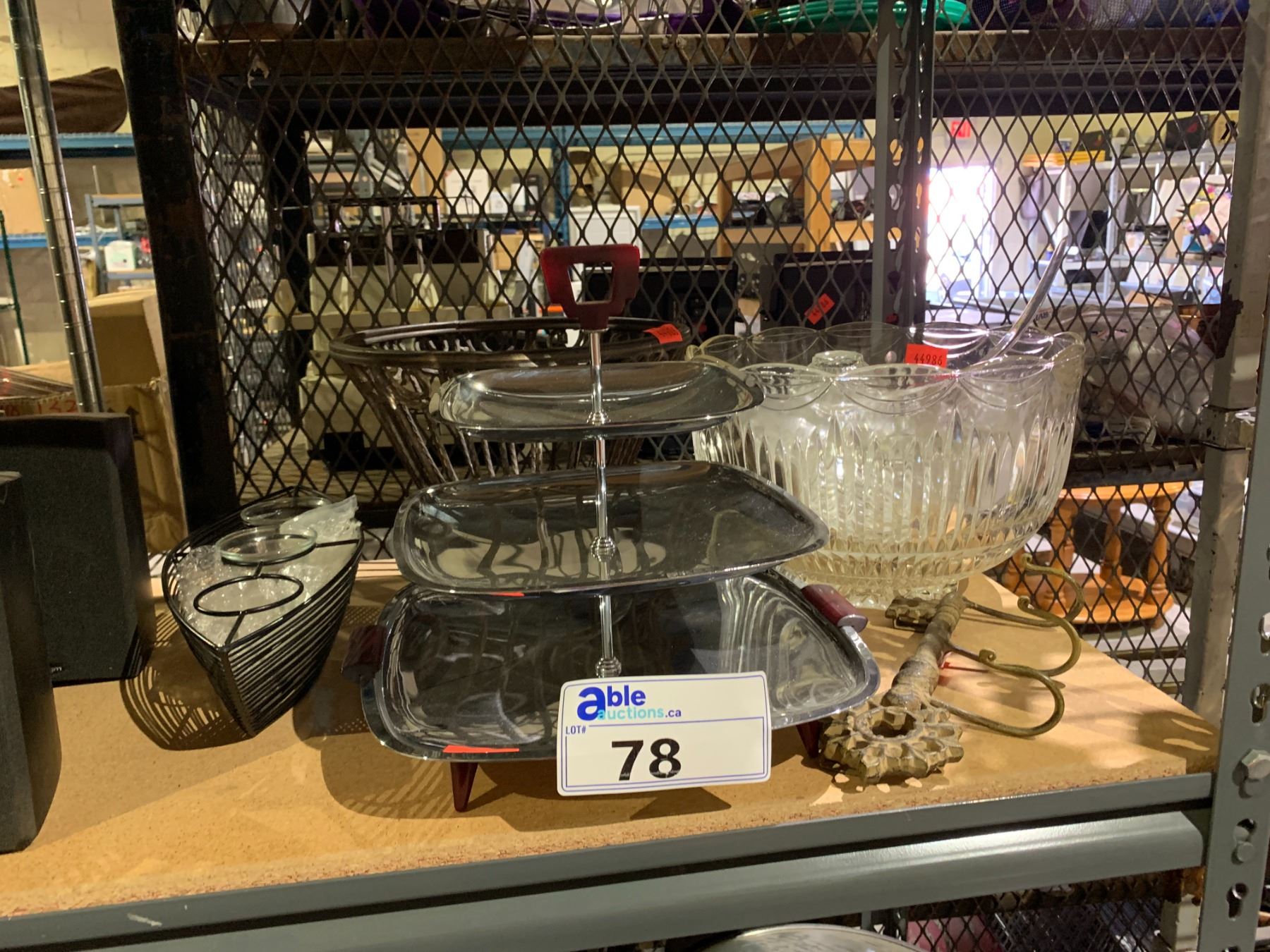 LOT OF SERVING TRAY, GLASS PUNCH BOWL AND MORE