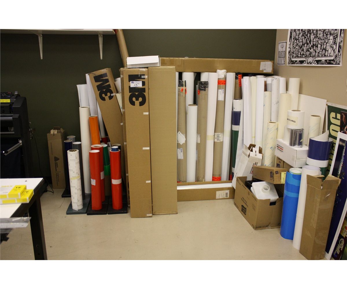 LOT OF SIGN SUPPLIES AND VINYL IN CORNER
