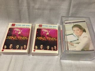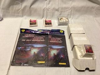 LOT OF STAR TREK COLLECTOR SETS INC: 2 SETS OF 1979 TOPPS RAINBO TRADING CARDS -  MAJEL BARRETT 16 CARD SET -  3 SETS OF START TREK TNG PANINI -  AND 2 STAR TREK TNG PANINI SEALED ALBUMS WITH 240 STICKERS EACH