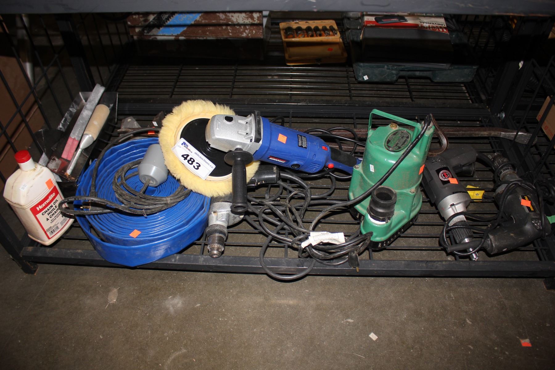 LOT OF TOOLS INCLUDING BUFFER, FLAT LAY HOSE, CROW BARS, CHAIN OIL AND MORE