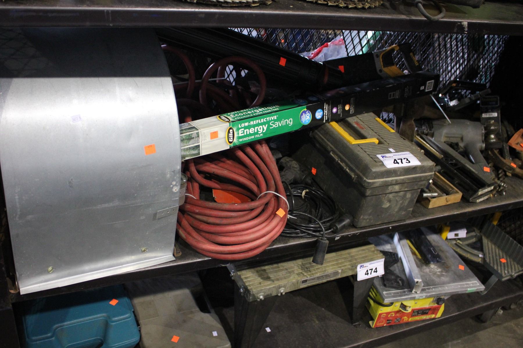 LOT OF TOOLS INCLUDING LOW REFLECTIVE ENERGY SAVING WINDOW FILM, TOOLBOX WITH CONTENTS, SENCO NAILER AND MORE