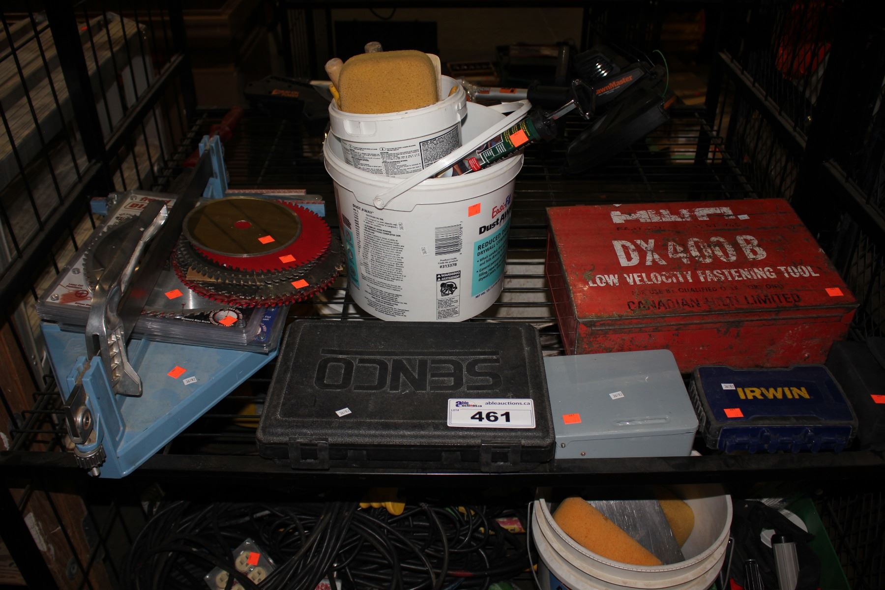 LOT OF TOOLS INCLUDING SENCO NAIL GUN, SAW BLADES, LARGE PAPER CUTTER, TOOL KITS WITH CONTENTS AND MORE