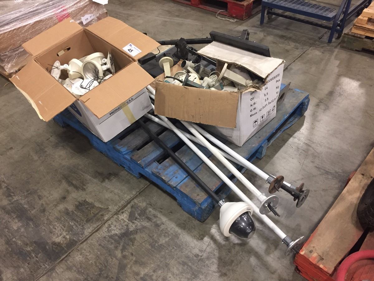 LOT OF TRACK LIGHTING, SURVEILLANCE CAMERAS, SCREENS AND MOUNTS
