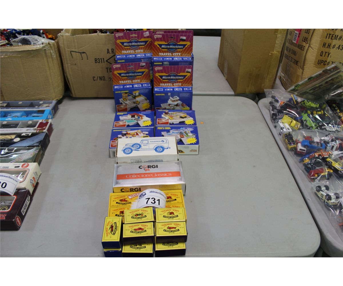 LOT OF VINTAGE MATCHBOX, CORGI AND MICRO MACHINES MODEL CARS AND DISPLAYS SETS W/ ORIGINAL PACKAGING
