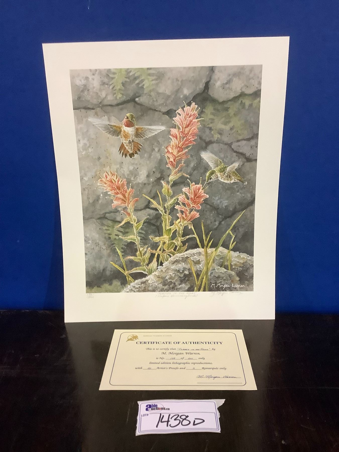 M.MORGAN WARREN ARTIST SIGNED LEP 138/200 WITH COA TITLED "FLAMES IN THE ROCKS" (RUFOUS HUMMING BIRDS)