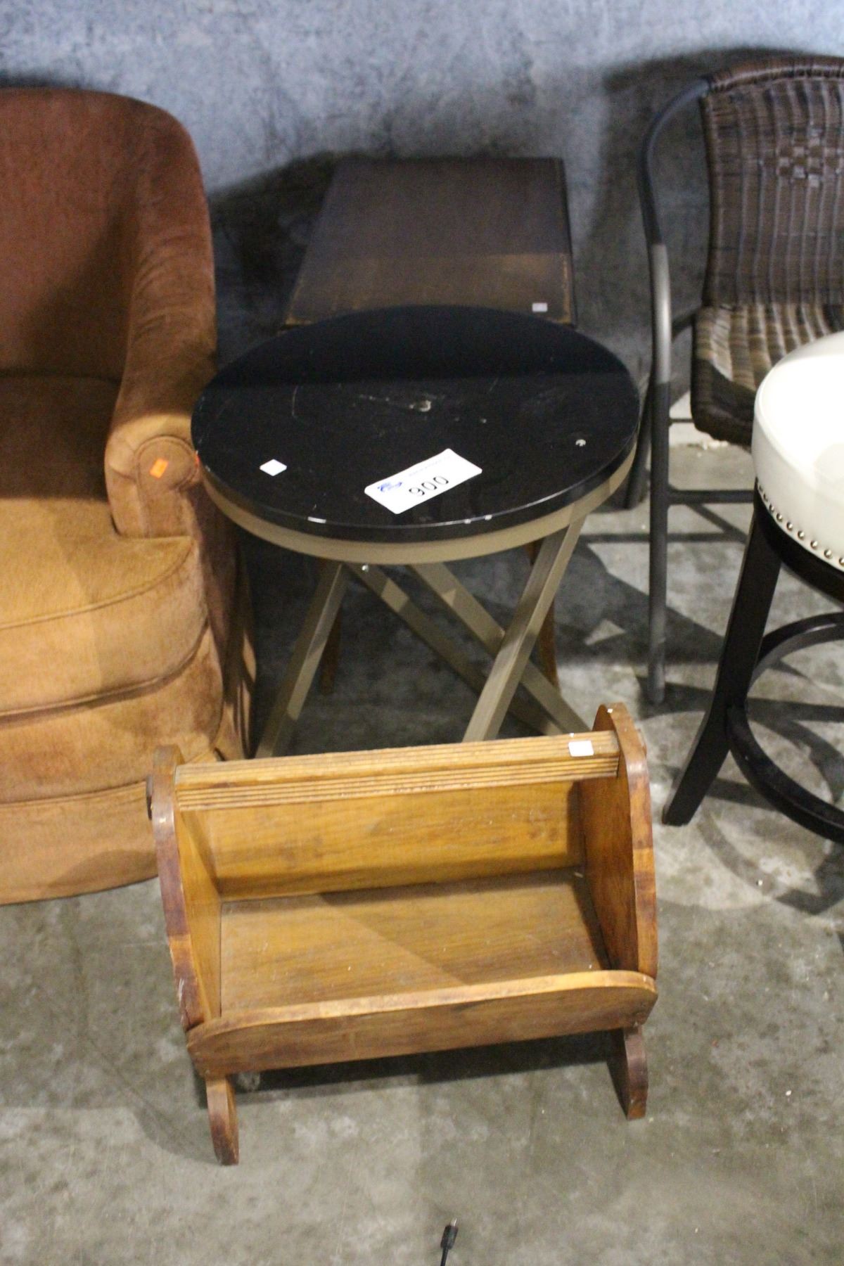 MAGAZINE RACK, SOFA TABLE, WOOD TABLE WITH BLACK TOP AND WALNUT END TABLE