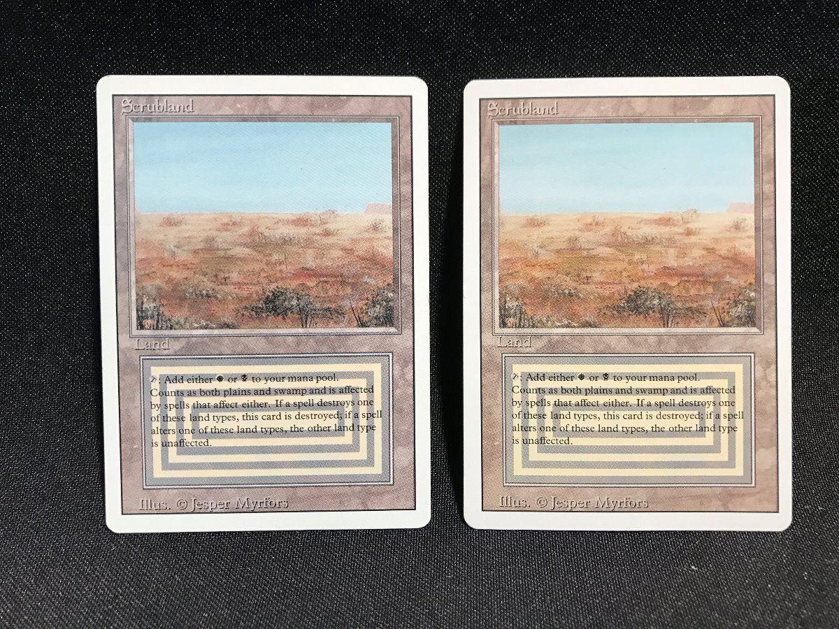 MAGIC THE GATHERING, PAIR OF COLLECTABLE CARDS INCLUDING: 2 X REVISED SCRUBLAND NEAR MINT CONDITION