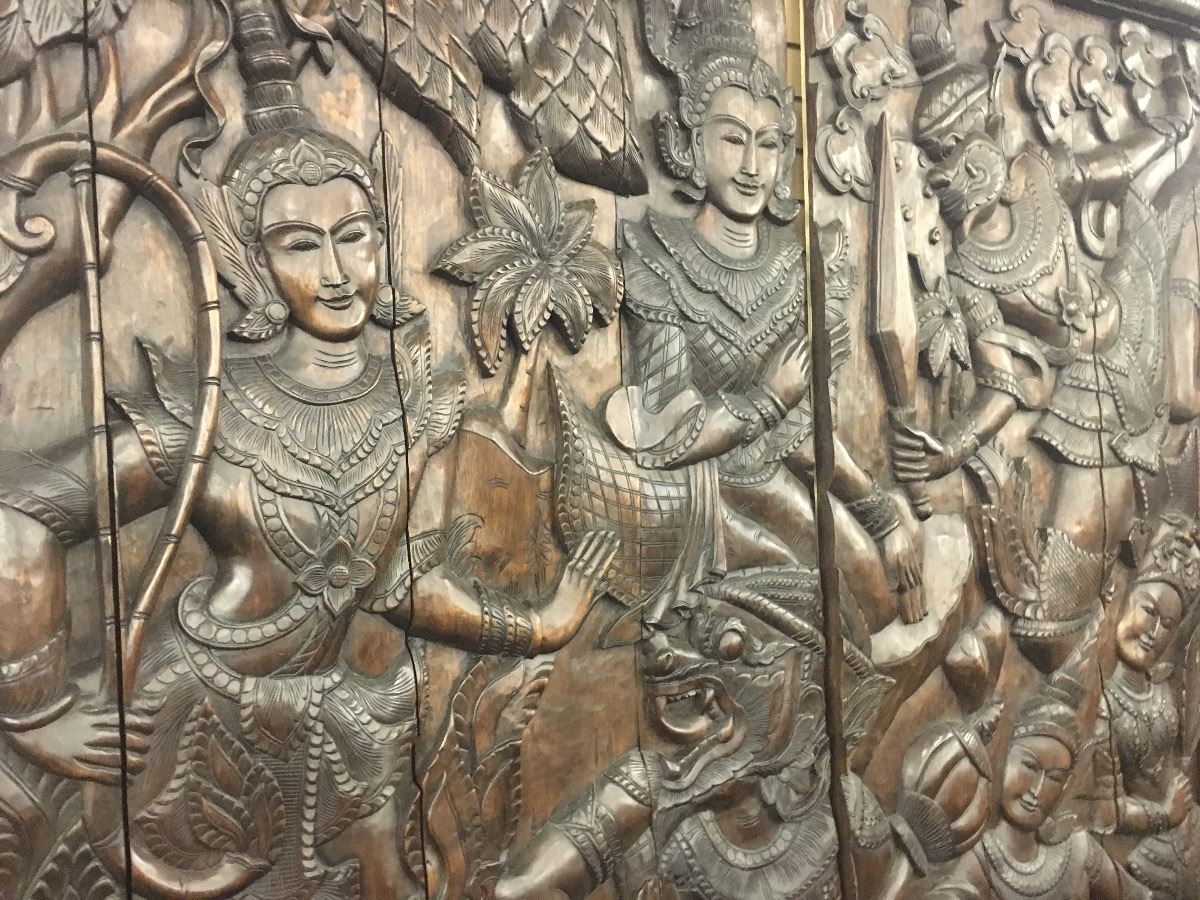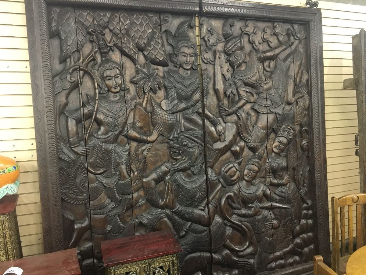 MAGNIFICENT PAIR OF HEAVILY CARVED TEMPLE DOORS DEPICTING A WARLORD AND PRIESTESS, 8' X 8' FROM BALI