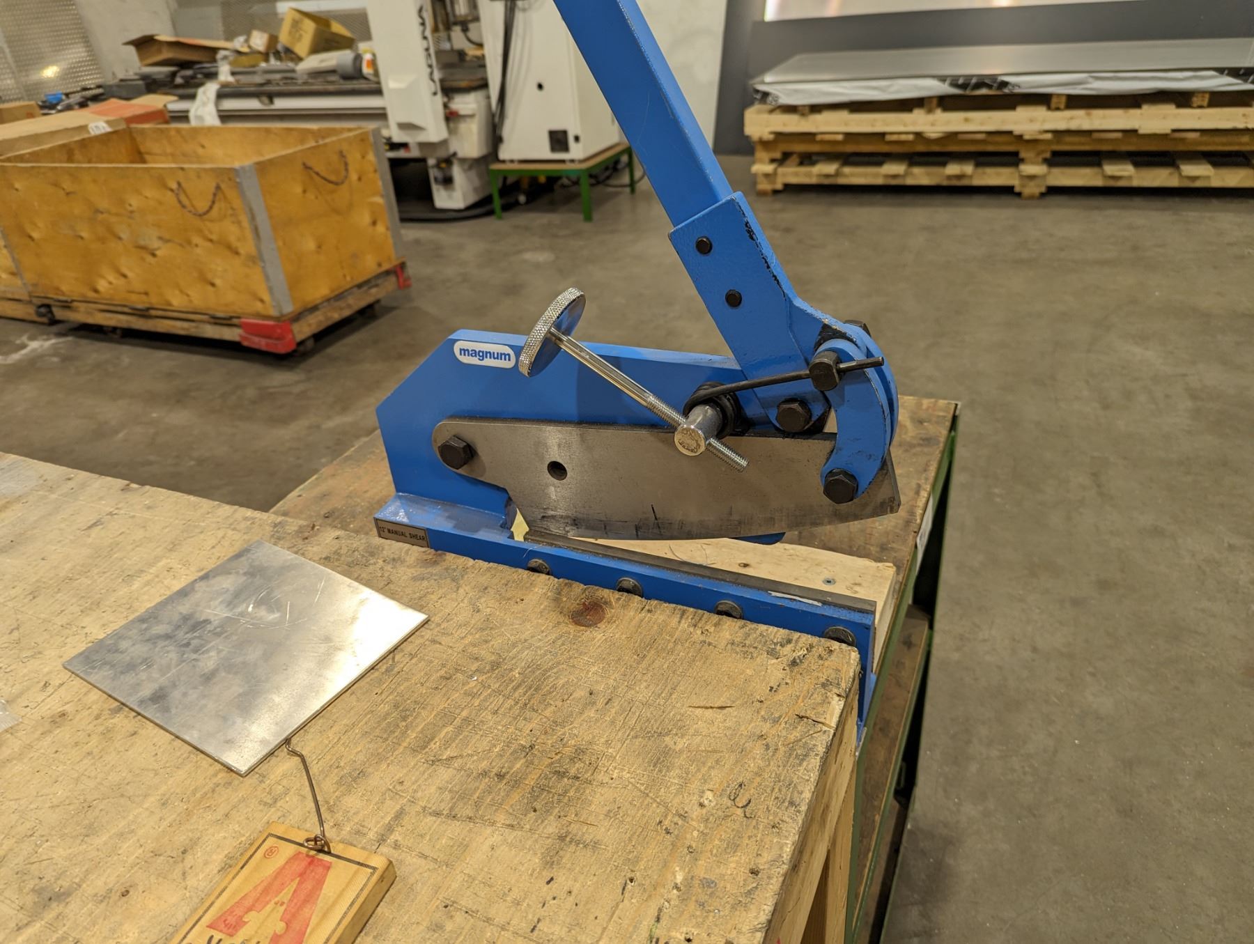 MAGNUM 12" MANUAL SHEAR ON ROLLING CART ATTACHED TO 4X8' WOOD WORK TABLE. CONTENTS OF TABLE NOT INCLUDED.