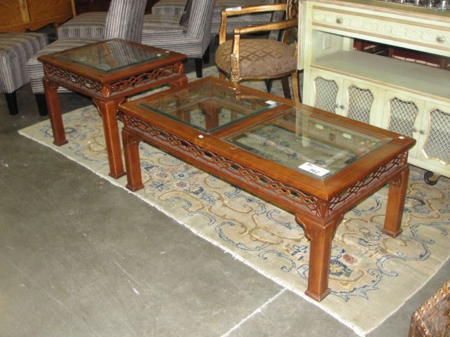 MAHOGANY AND GLASS TOP COFFEE AND END TABLE SET