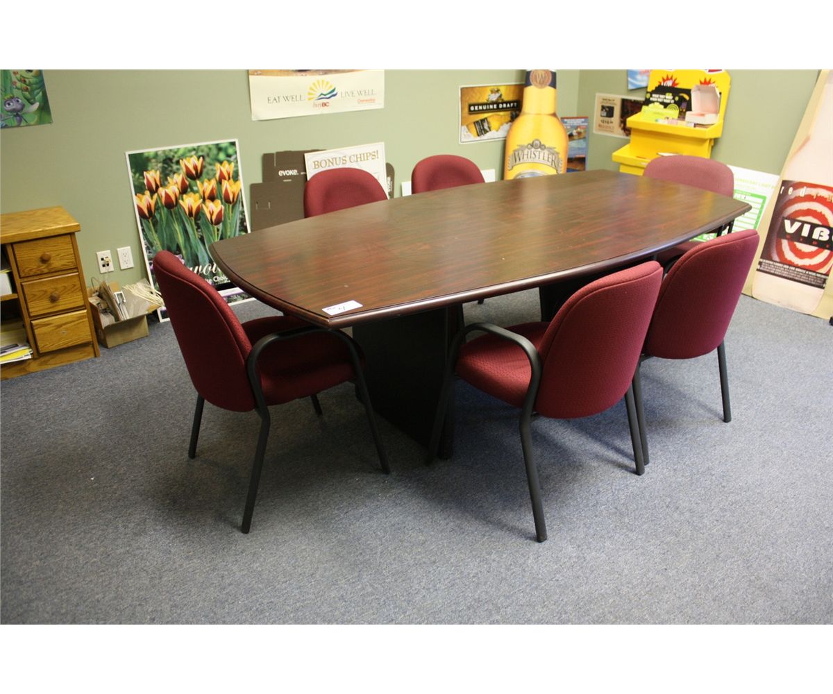 MAHOGANY BOARD ROOM TABLE, SIX CHAIRS, OAK DESK AND CONTENTS