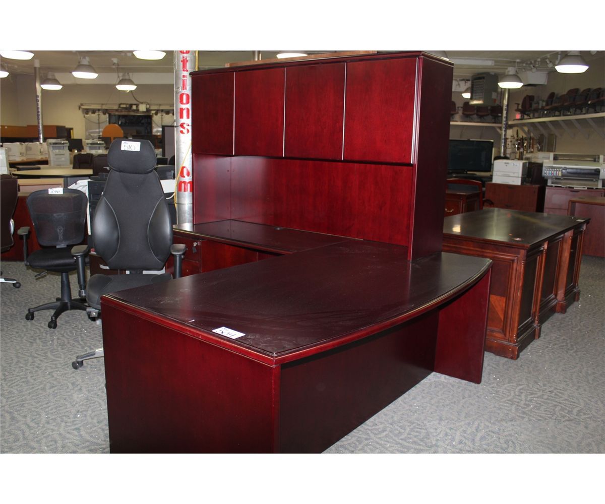 MAHOGANY BOWFRONT 6' EXECUTIVE L SHAPED DESK C/W HUTCH